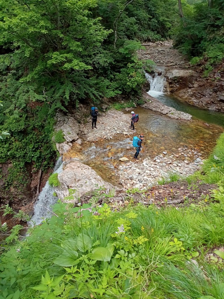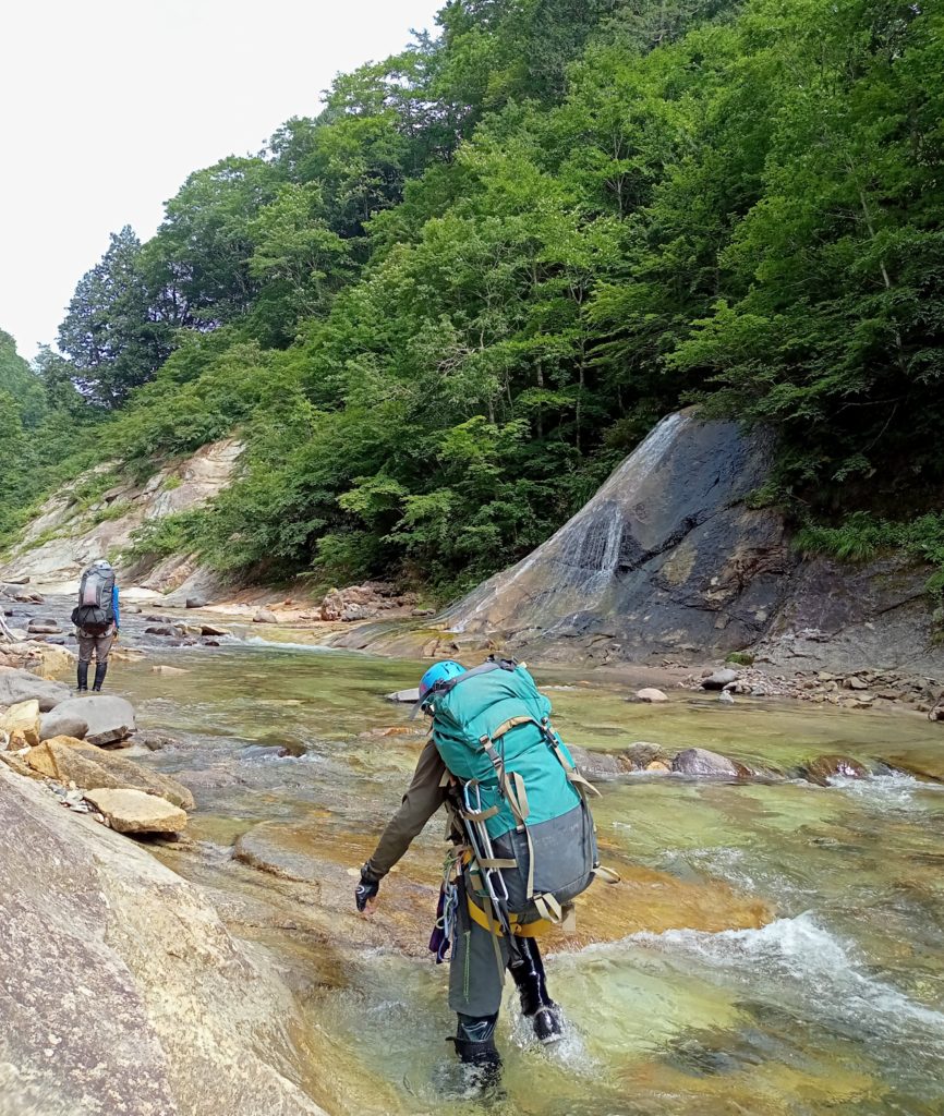 焚火の始末を済ませて出発。女子2人は虫刺されが腫れ上がって痛々しい姿になってしまったが睡眠、栄養とも足り元気は充分。30分弱で滝ノ又沢出合。左岸の幕場にはまだツェルトが張られていた。更に15分ほど進むと北ノ又沢右股と左股の出合。