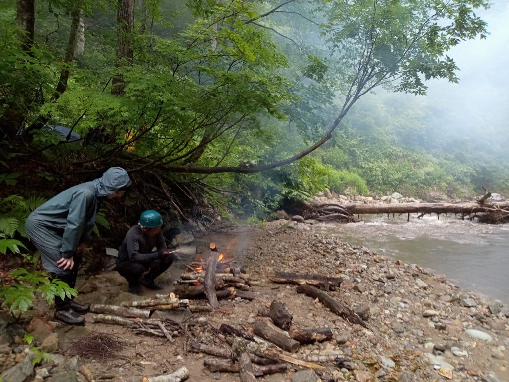 雨が止まず焚火をするか迷ったが、時間も早いので薪集めを始める。ミズナラの倒木を鋸で切ってそこそこの量を集められたが、倒れているだけで枯れていない生木なのと、降雨の中なので火付けの難易度が高い。ここは山ちゃんにお願いするより他ない。