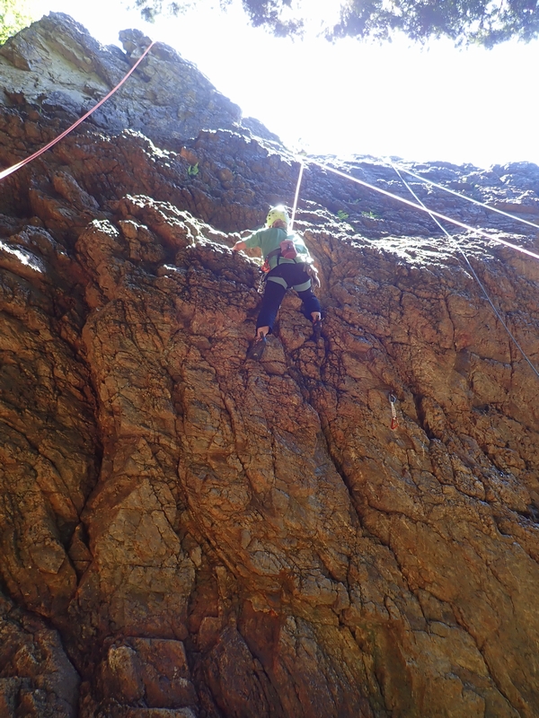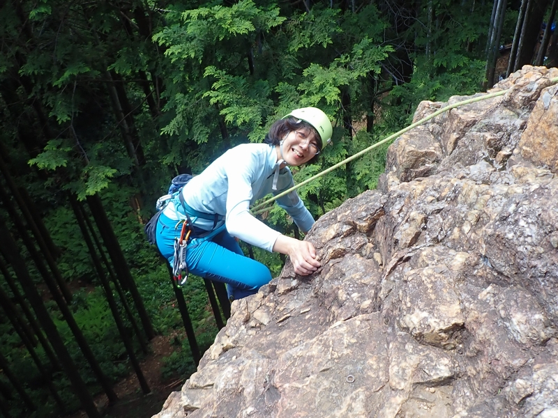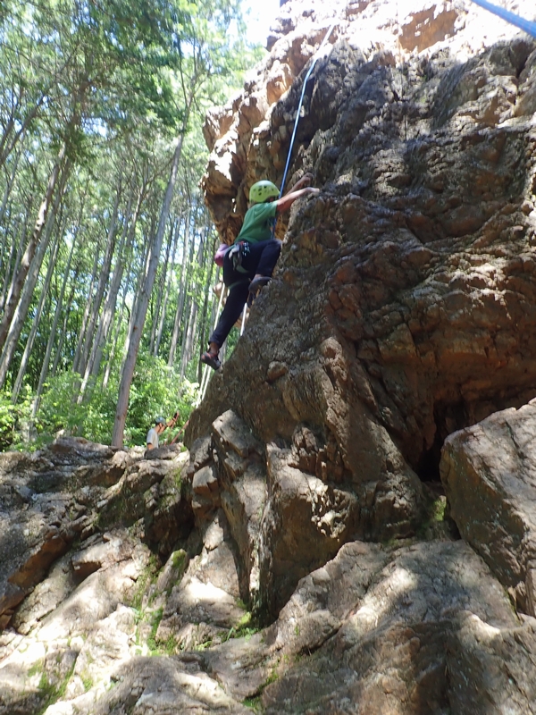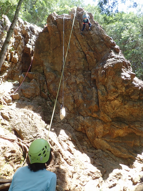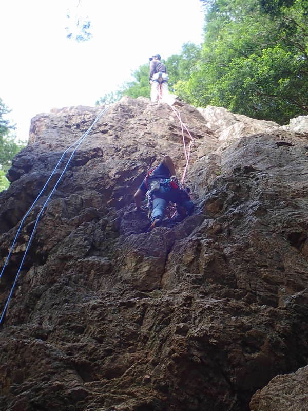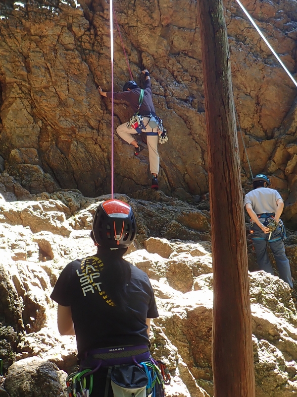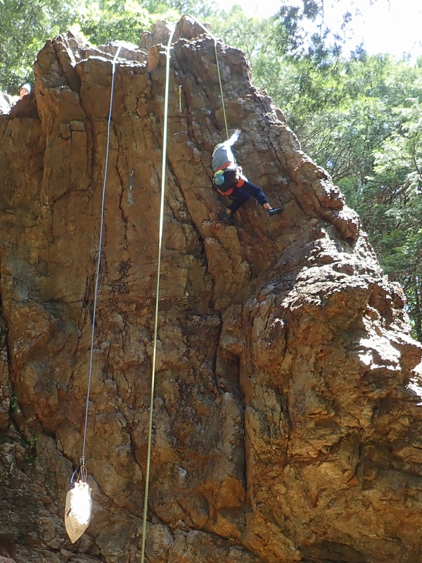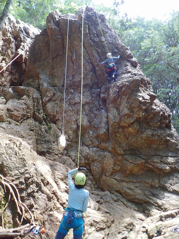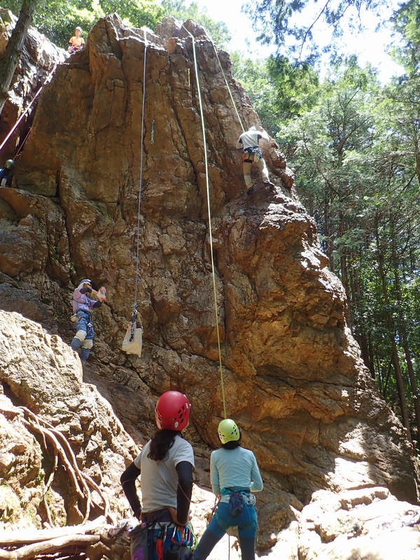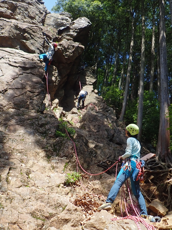 さっそくヒトミちゃんとテッシーが男岩西面にトップロープをセット。