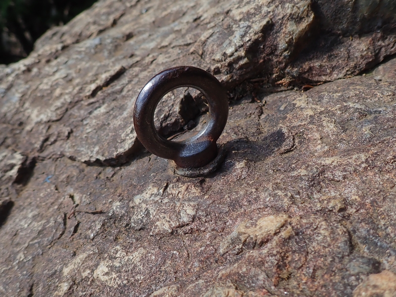 ここでヒヤリハット。アイボルト1本にロープを通して懸垂下降しているところを見てしまいました。このボルトはクライミング用ではないので、強度的に信頼できません(ABスタンダード15「外岩デビュー③ボルトについて」参照)。初めて見るボルトだったのかもしれませんが、ラッペルステーションは、必ず2ヶ所以上のボルトが連結されていることを思い起こしましょう。