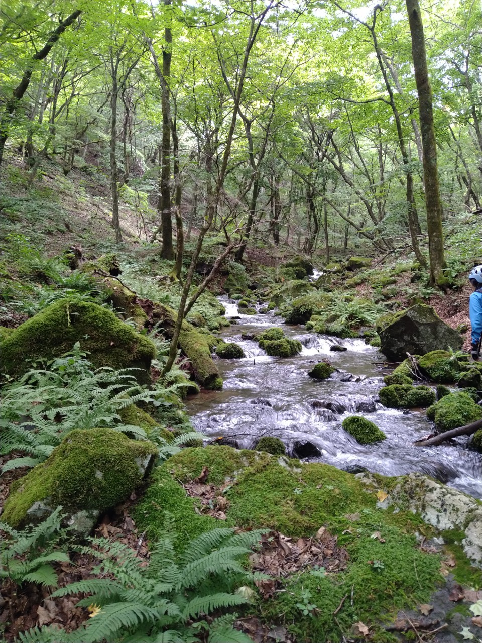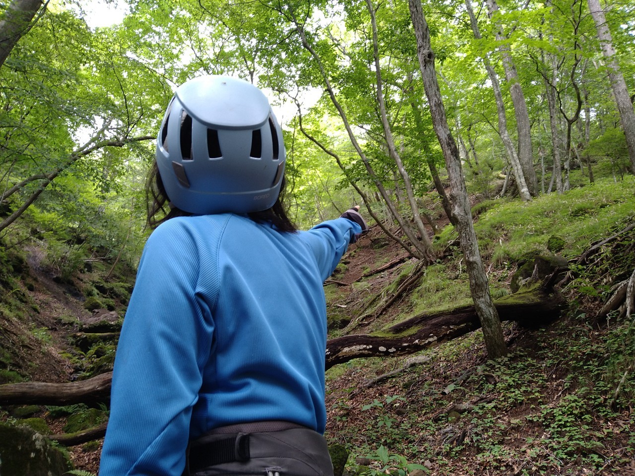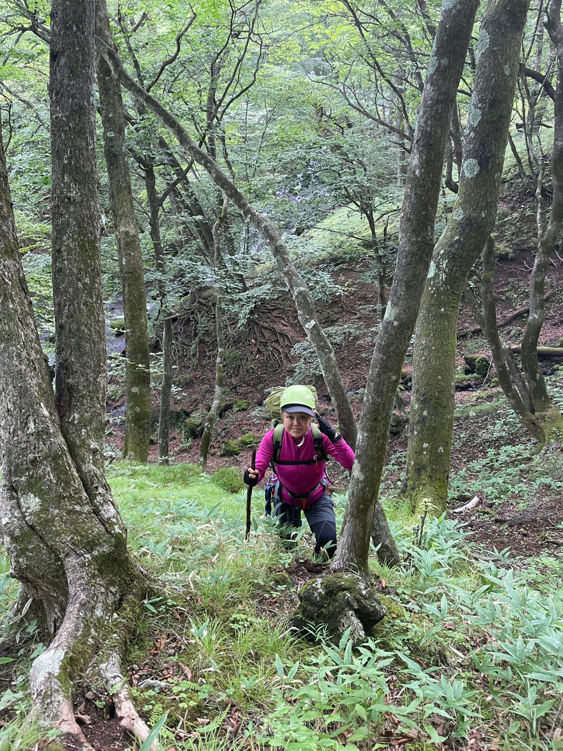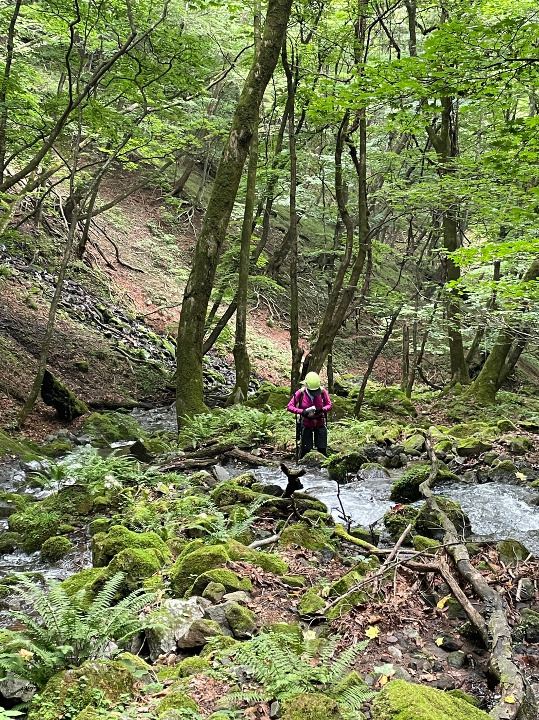 ゆっくり沢歩きを楽しみ、終了点の25m滝でそうめんで1時間ゆっくりランチ休憩をした。 25m滝はロープなしで登れそうだったが、また下りてこなくてはならず、省略して滝の手前を詰めることにした。 出だしはガレていて急だが、15分ほどで登山道に合流。 膝丈の笹平を東へ進む。西は女峰山への登山道だが、この道は上がってくる人が少ないので、かろうじて踏み跡がわかるくらいだ。 巨大な杉の下に祀られた石祠を過ぎるとP1039付近は非常に道が不明瞭なのだが、ピンクテープ、キラキラの銀色のテープがひらひらと下がっていて、案内をしてくれるので、そう悩まずに滝から1時間で駐車場まで下りてきた。 癒しの良い沢だった。初めての沢歩きにもおすすめ。