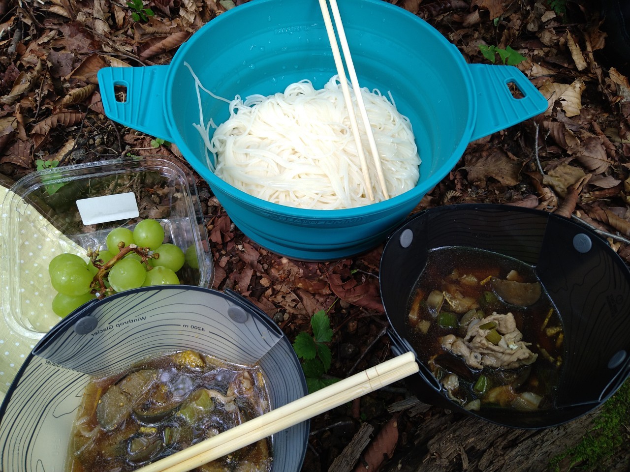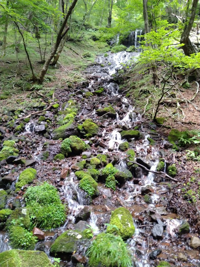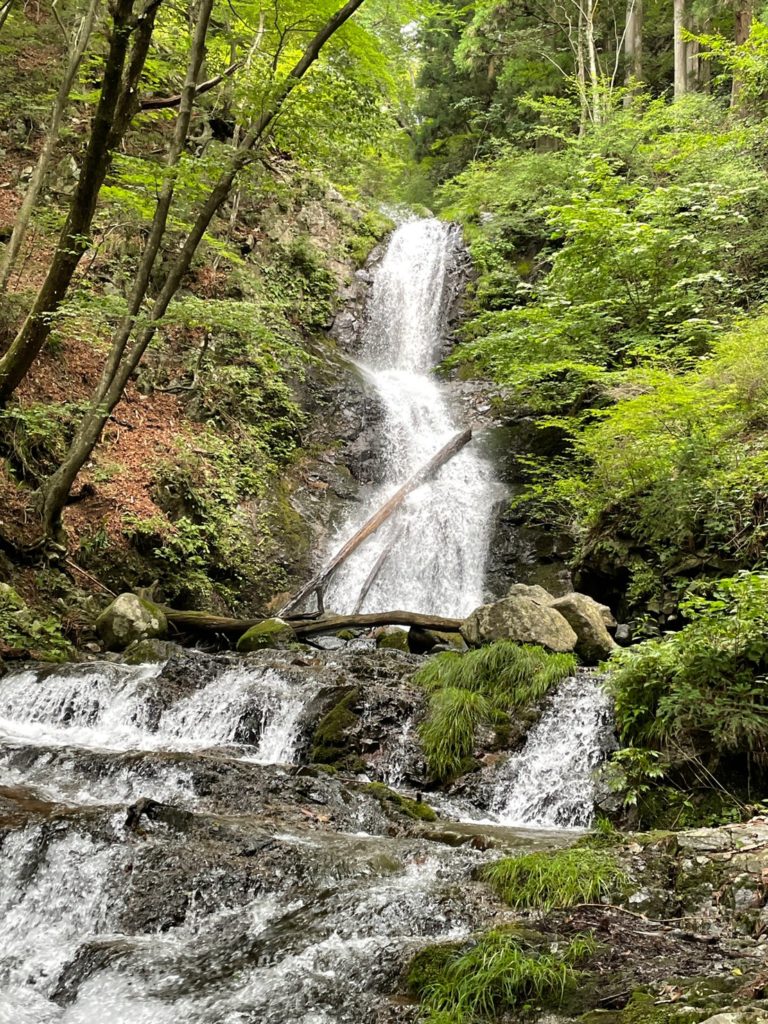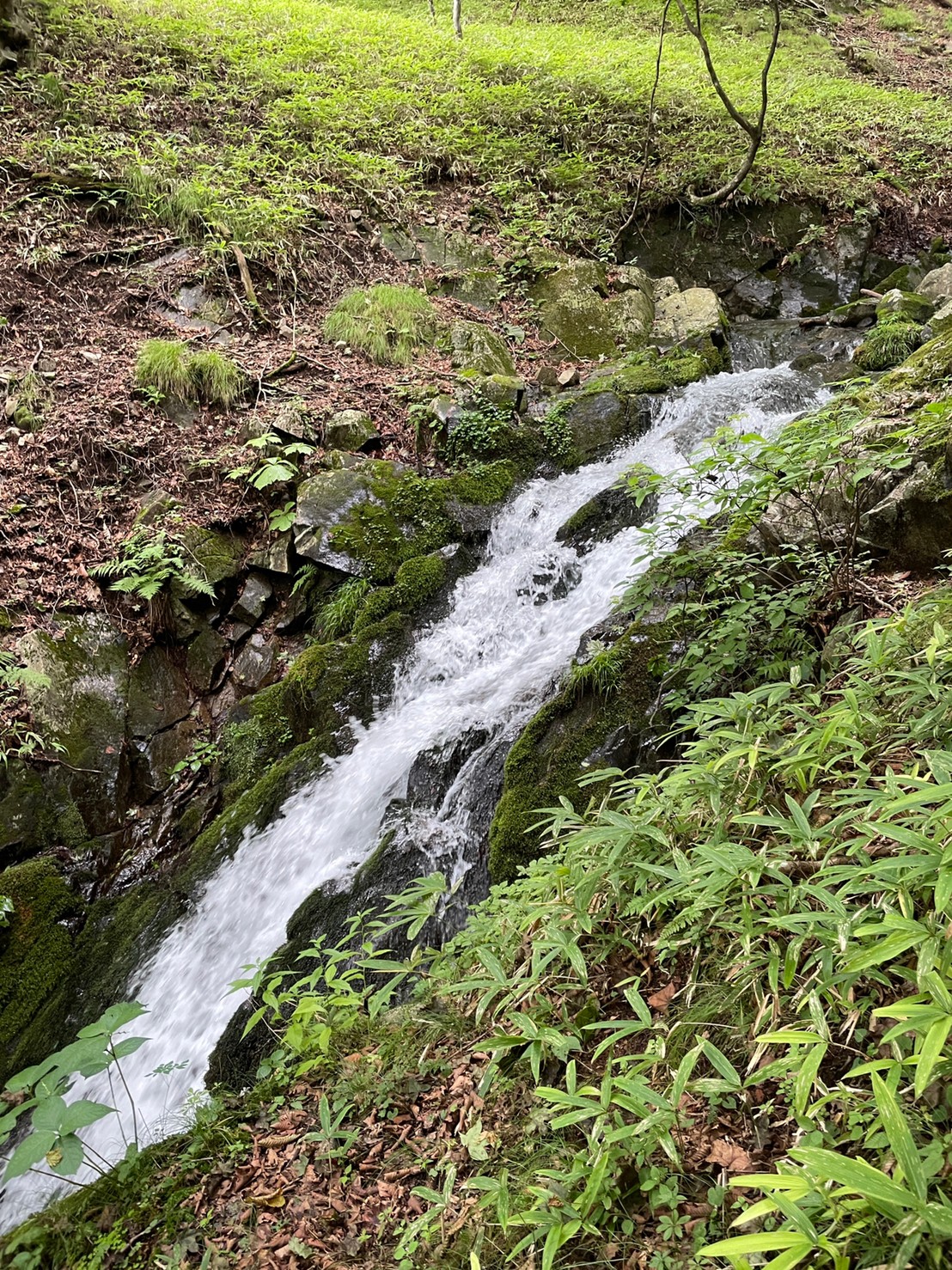 ゆっくり沢歩きを楽しみ、終了点の25m滝でそうめんで1時間ゆっくりランチ休憩をした。 25m滝はロープなしで登れそうだったが、また下りてこなくてはならず、省略して滝の手前を詰めることにした。 出だしはガレていて急だが、15分ほどで登山道に合流。 膝丈の笹平を東へ進む。西は女峰山への登山道だが、この道は上がってくる人が少ないので、かろうじて踏み跡がわかるくらいだ。 巨大な杉の下に祀られた石祠を過ぎるとP1039付近は非常に道が不明瞭なのだが、ピンクテープ、キラキラの銀色のテープがひらひらと下がっていて、案内をしてくれるので、そう悩まずに滝から1時間で駐車場まで下りてきた。 癒しの良い沢だった。初めての沢歩きにもおすすめ。
