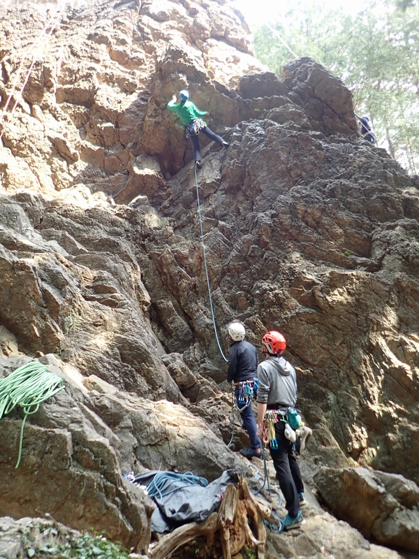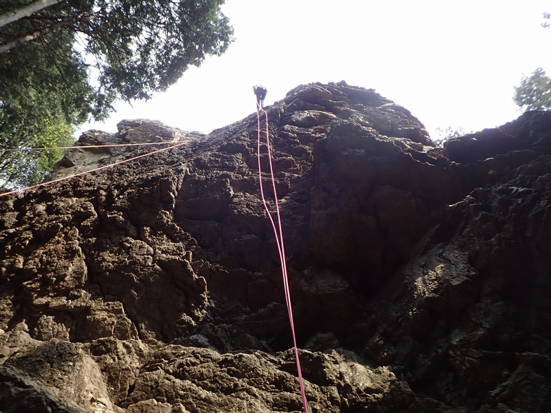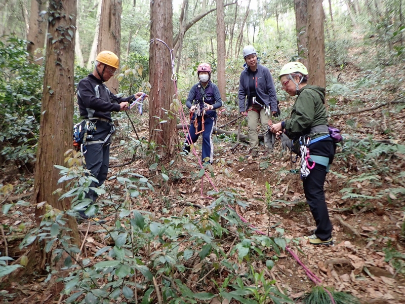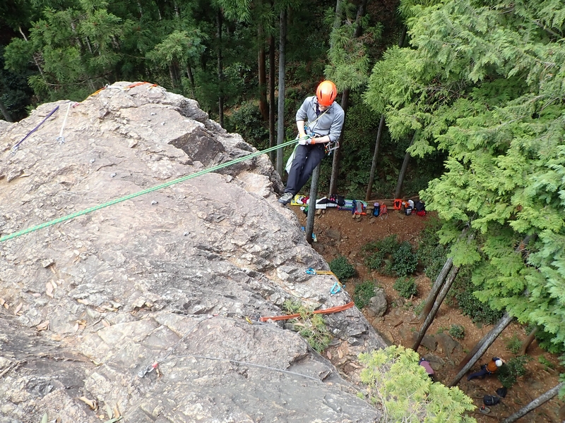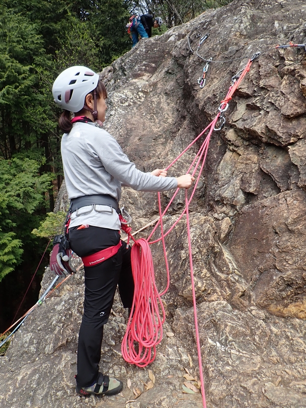 ヨーコ会長、K下パパ、タミちゃん、ペコちゃんは、トップロープを楽しんだ後、懸垂下降のセットを練習。