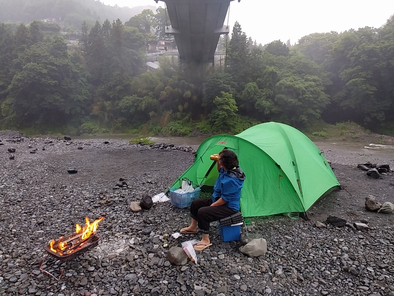 前日の金曜日は、川井キャンプ場に泊まって朝発メンバーを待ちます。天気予報は決して良くありませんが、キャンプ場に電話したところ、河原に泊まっても大丈夫ということでした。