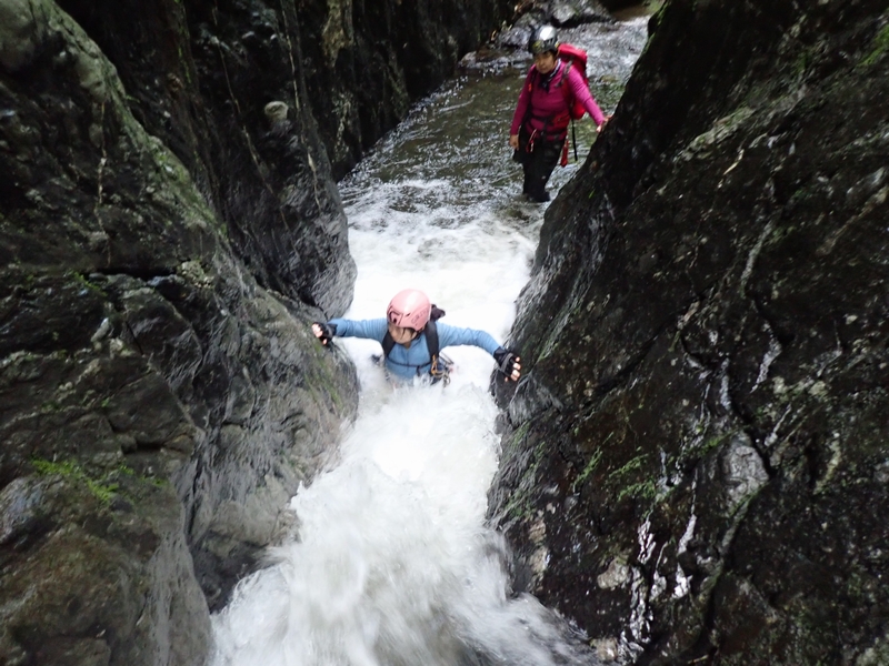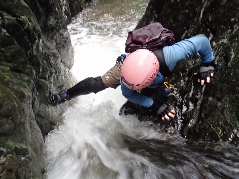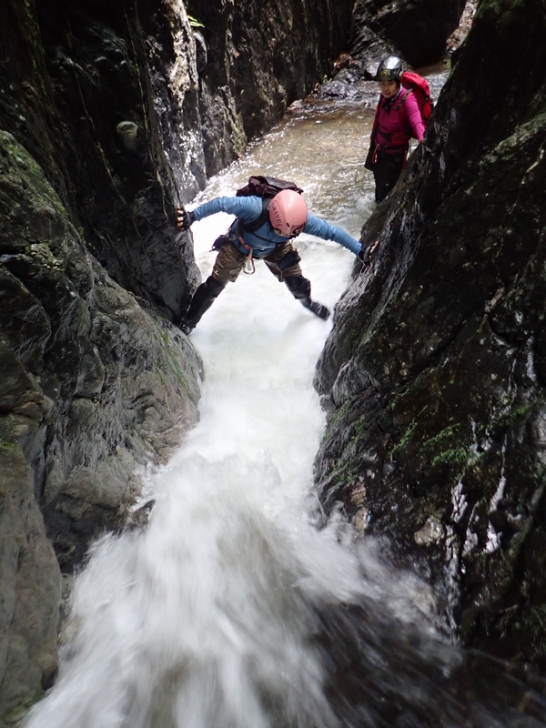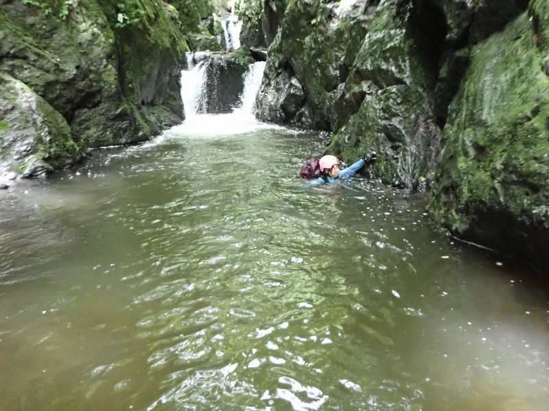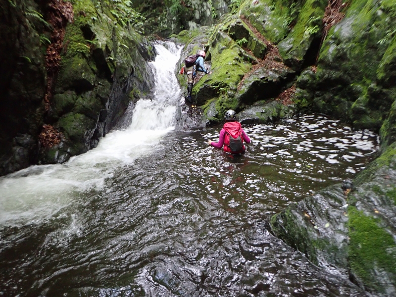 12:10 半円の滝。先行者が取り付いていたので、一旦脇から登り、空身で再度登り返す。