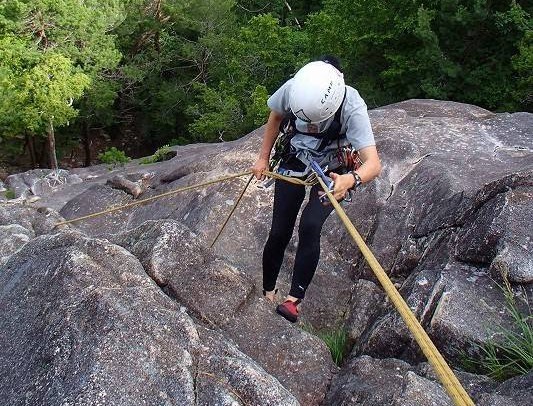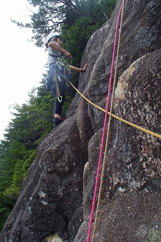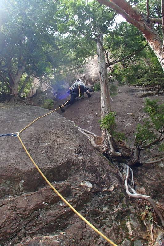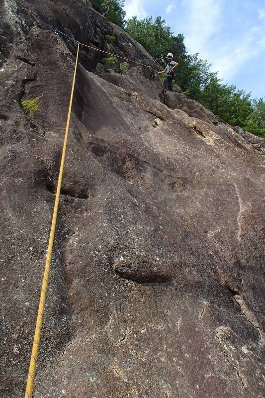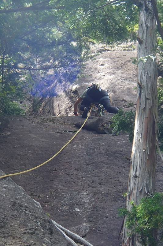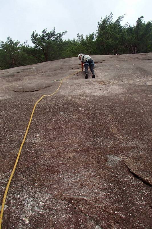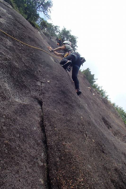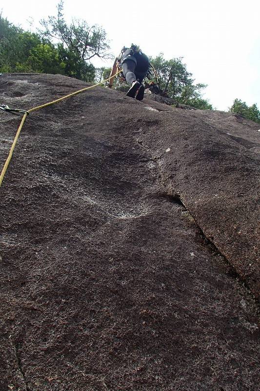 終了点のあるテラスの手前、見えているガバに届くための一歩にもやはり相当勇気が要った。自分としては本当にギリギリ。フォローで上がってきた大師匠が「思ったよりも難しかった、よく頑張ったなぁ」と褒めて下さった。スラブのグレードとしては、5.9はあるだろうとのこと。相変わらずのスパルタである…。
