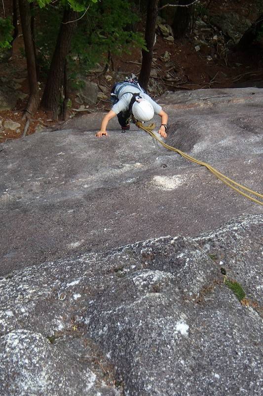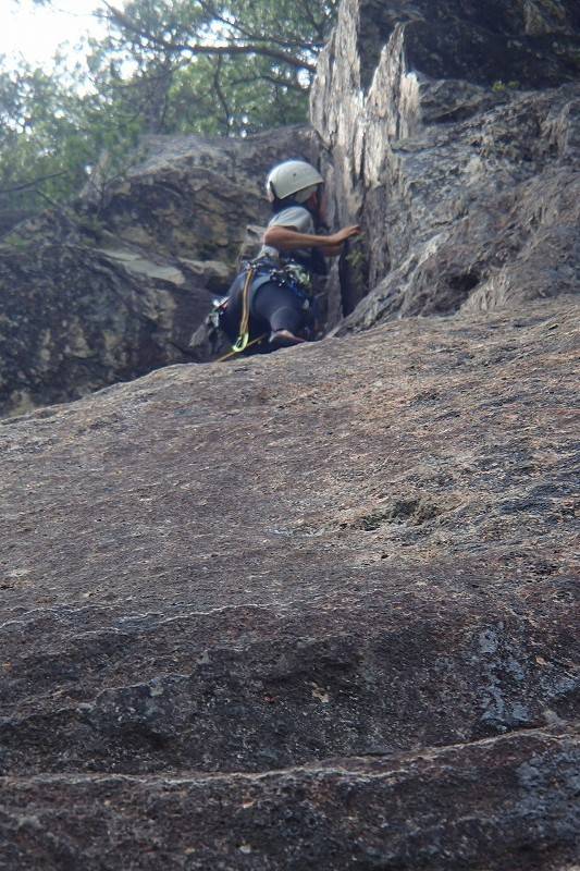 ガマスラブは混んでいるので早めに切り上げて、踏み跡を辿ってガマルートの取付きへ。ガマスラブのトップからトラヴァースしてきた5人パーティと合流するような形になった。彼等はガマルートへ、私達はガマルートより左側(ガマルートの派生ルートではなく、もっと左側)のルートへ。下部は10aはありそうなツルツルスラブなのでカットして、2ピッチ目から始めるような感じ。
