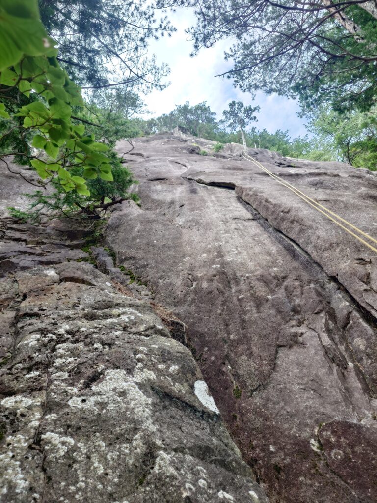 足慣らしで何本か登ってから移動しよう、と大師匠。一番左とその次はロープが掛かっている。3番目のルートは、ヌンチャクが掛けられているが空いているので、声をかけて登らせてもらう。ヌンチャクは上から自分のをかけて行こう。