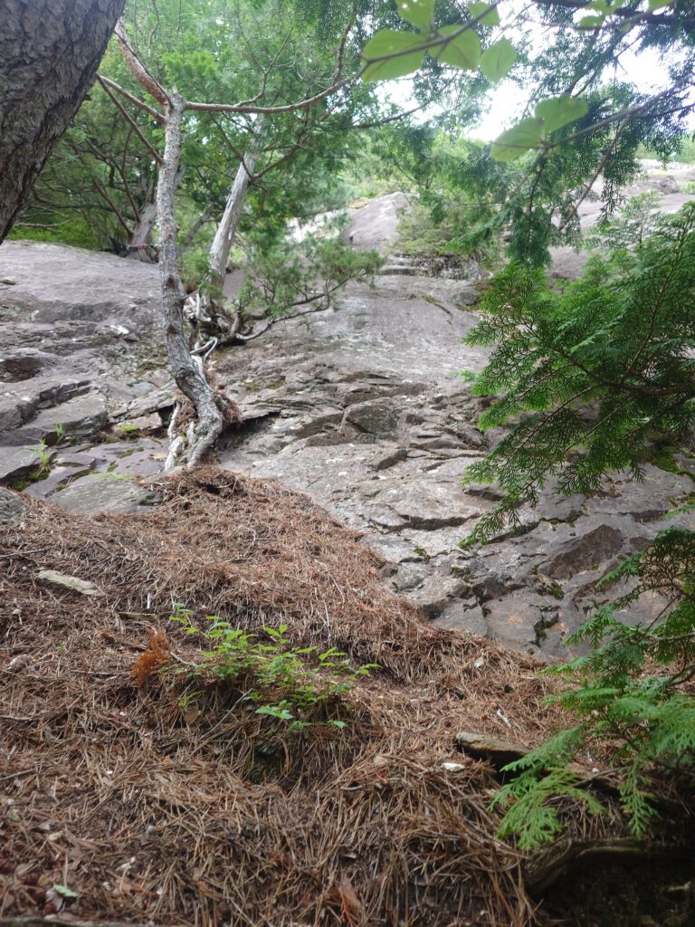 木陰の緩斜面を進んでゆくと現れる陽当たりの良い急なスラブには、正面から左上へ向かうボルトライン。左上のボルトには、なぜかピカピカの環付ビナが残置されていた。1本目は届いたのでクリップ。