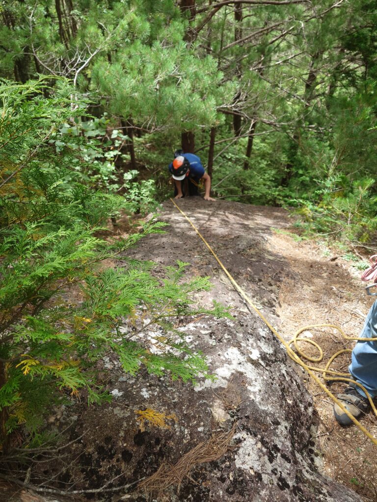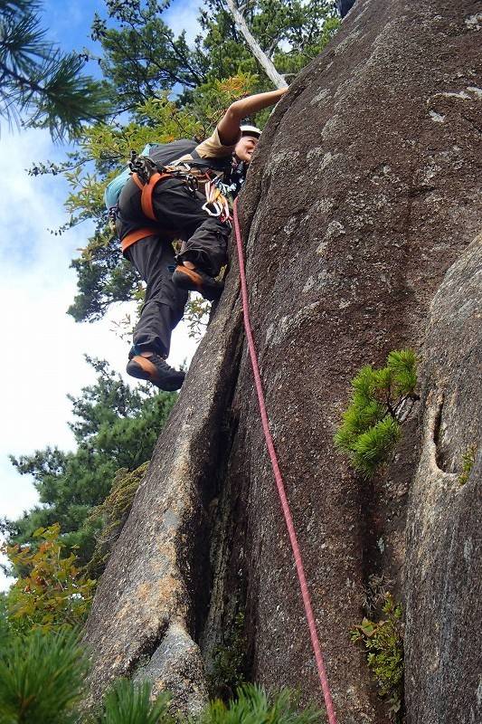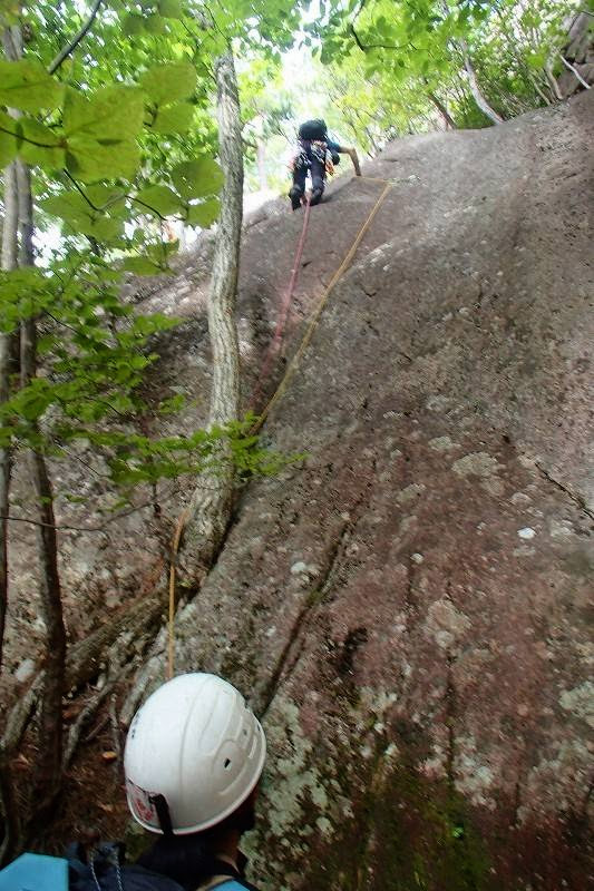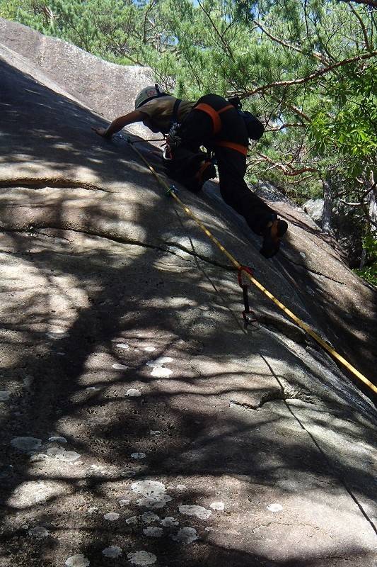 前回はほぼ懸垂下降で降りたけど、今日はルートの右側の薄い踏み跡を下る。まだ時間があるので、先月にも訪れたが濡れていて登れなかった水晶スラブへ。