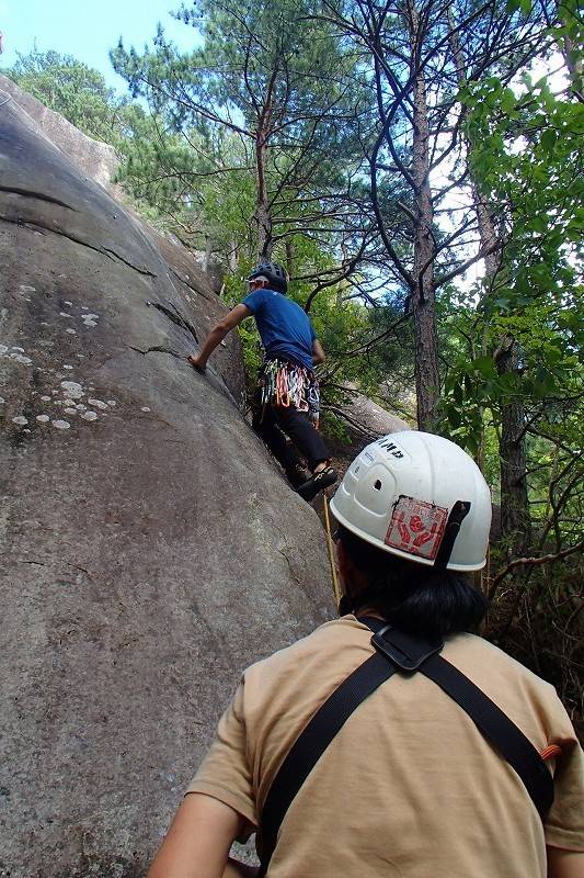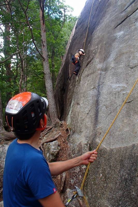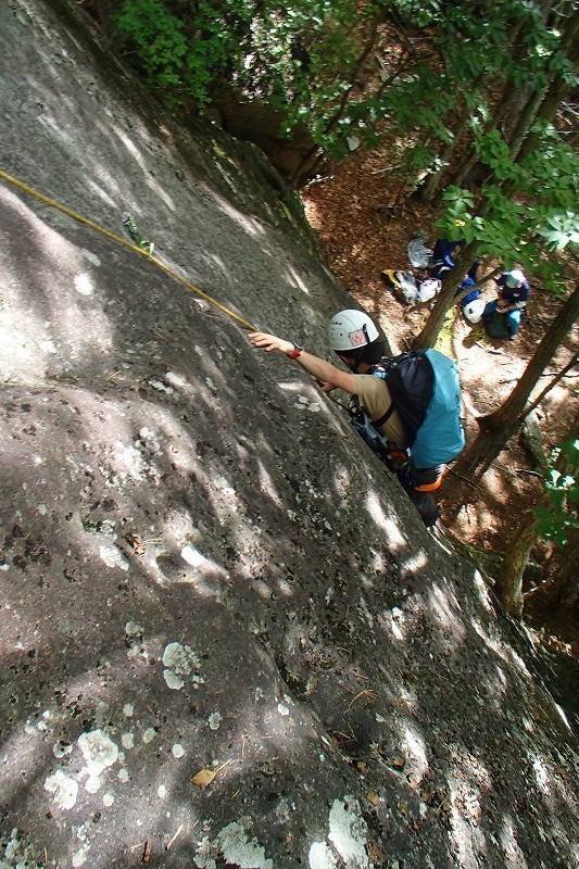 続いてS田氏もトライ。核心はやっぱりハイハイポーズになってしまった。こうなると滑るのよね。スラブの10aは厳しいです。核心を越えた後は余裕で、トップアウトした後に左側のルートを登るための振られ止めを付けてから降りてきてくれた。
