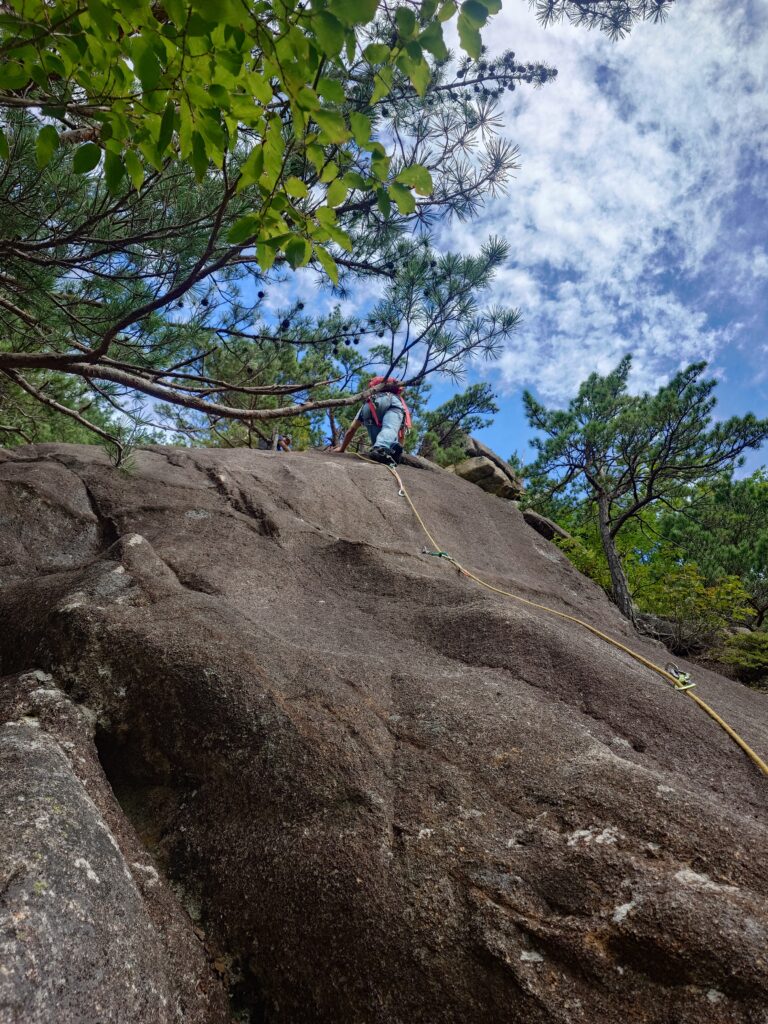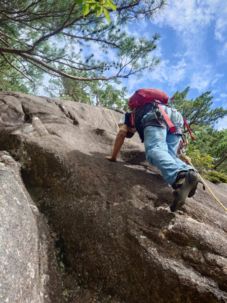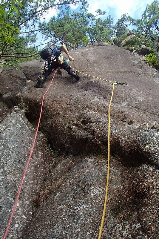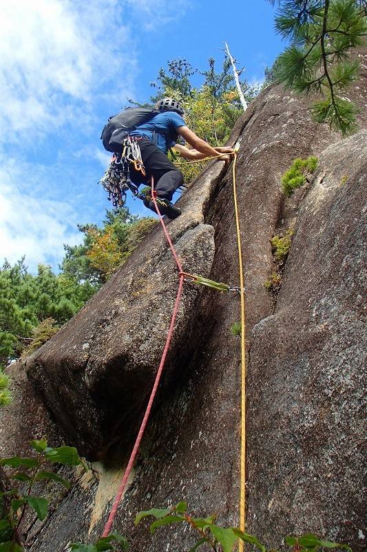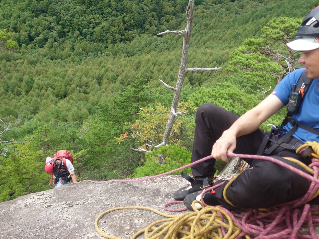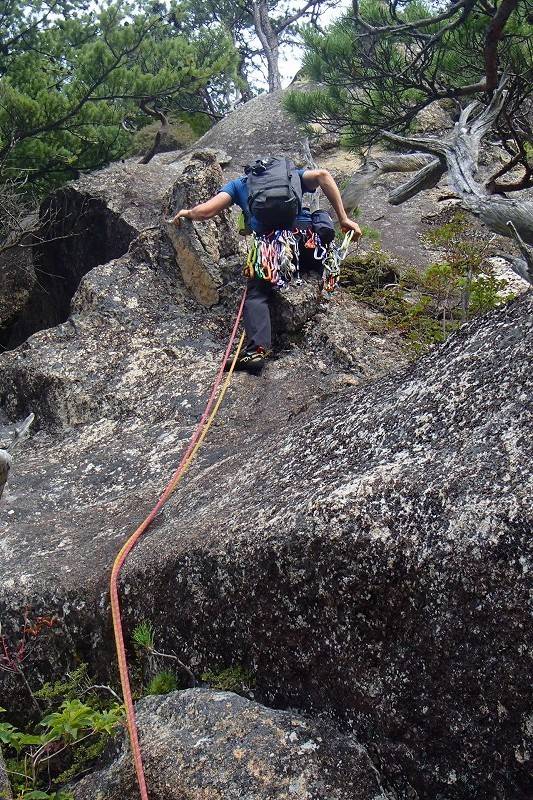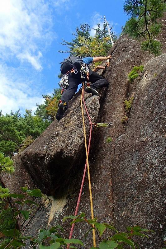 私は7月にオールリード(チョンボ有)で登っている(参照→https://alpenblume.club/?p=29376)ので、今日はS田氏がリード役。苦労した2、4ピッチ目はフォローだとどんな感じなんだろう?
