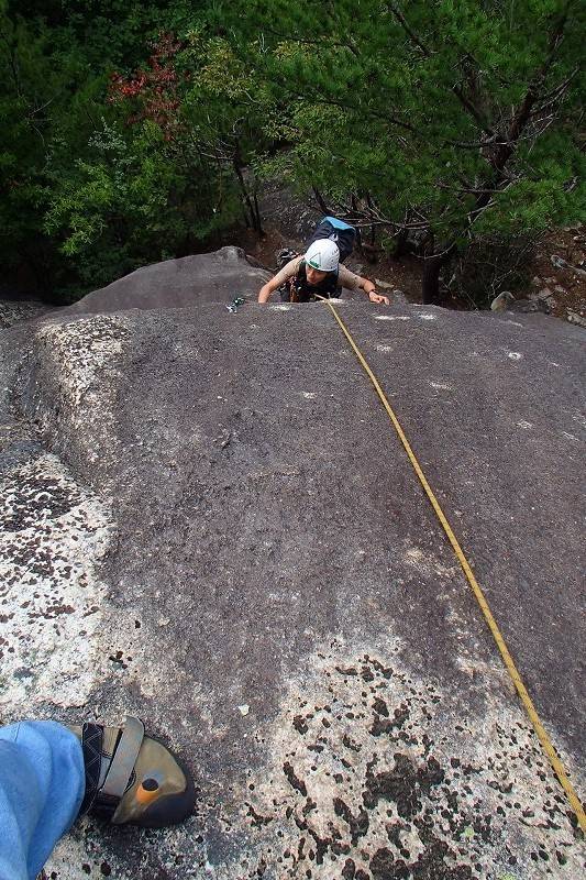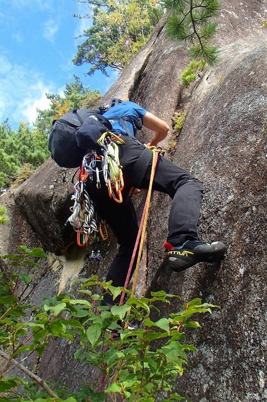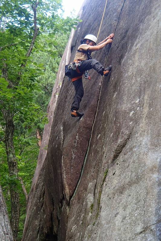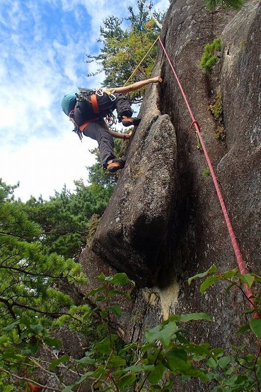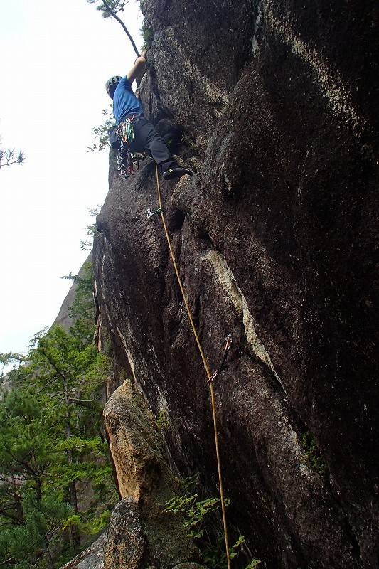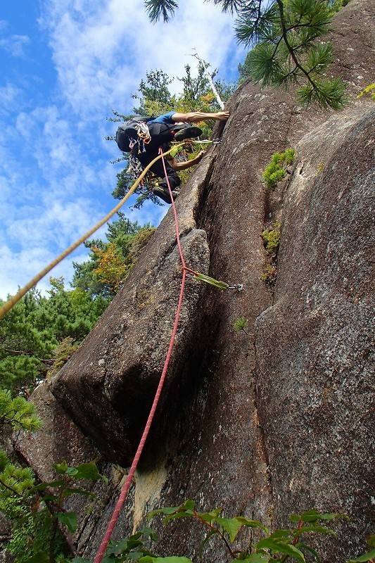 S田氏は2ピン目を取ったあと、クラック寄りに登っていきそう。別に違反でもないんだけど、なんか面白くないっ!…つい、心の声が洩れてしまったが、前回私が半泣きで頑張ったクラック左側のスラブをS田氏にもぜひ味合わっていただきたいのよ。