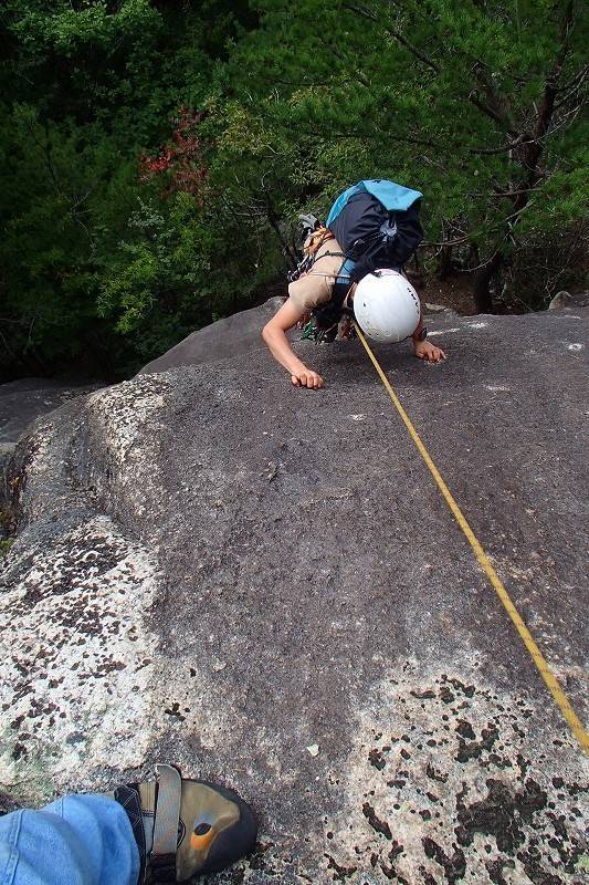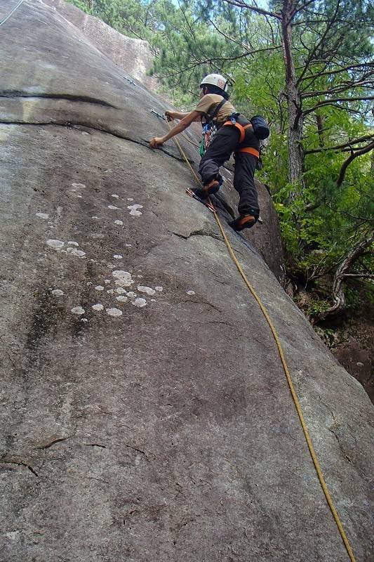2番手は大師匠。前回はリードの私が核心を超大回りで右に迂回したため急傾斜部分を登れなかったのだが、今日は直登チャレンジ。かなりキツそう。私もフォローだからトライしてみるか…