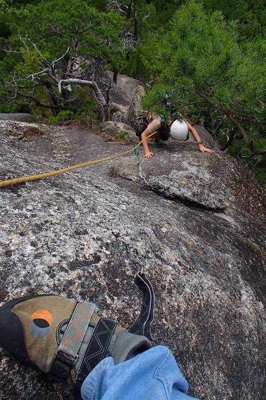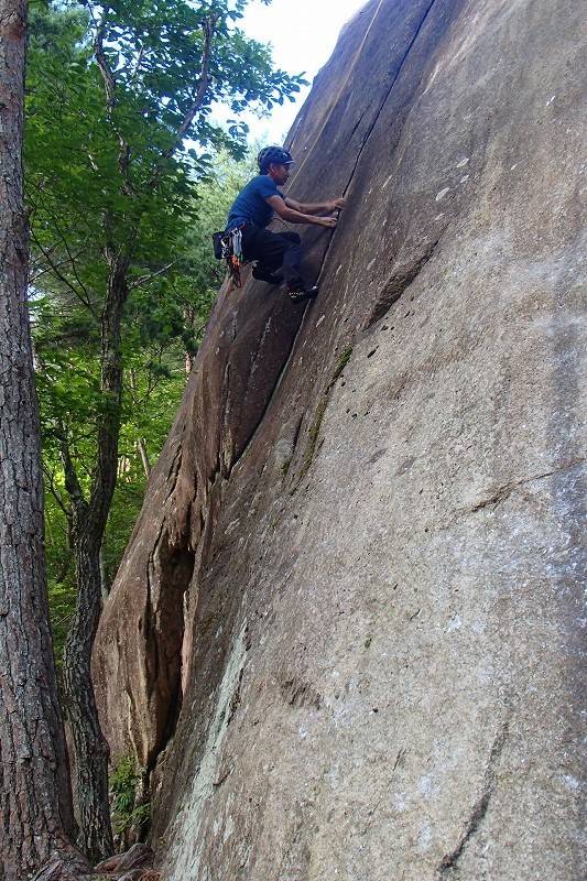 で、最後に左側のトポに載っていないルートを。フレークというには長いのでクラックで良いのかな、その隙間にちょうど指先が入る、レイバックがキマるルート。小さめのカムが決まるサイズだが、そんな余裕は無いのでトップロープ。