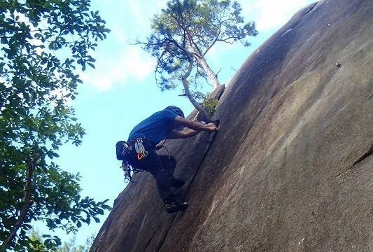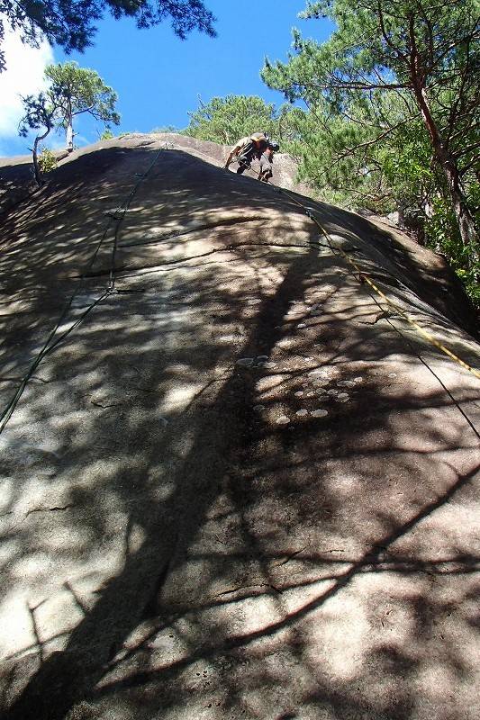 全体的に傾斜のキツいスラブで、一番易しいのは右端の一本。右から2番目のルート(「アバタもエクボ」10c)で修行中の2人組が右端のルートにもヌンチャクをかけていたが、使って良いですよ〜と言って下さった。大師匠から「余裕があったらヌンチャクを自分のと取り替えてきて」なんて言われてスタート。