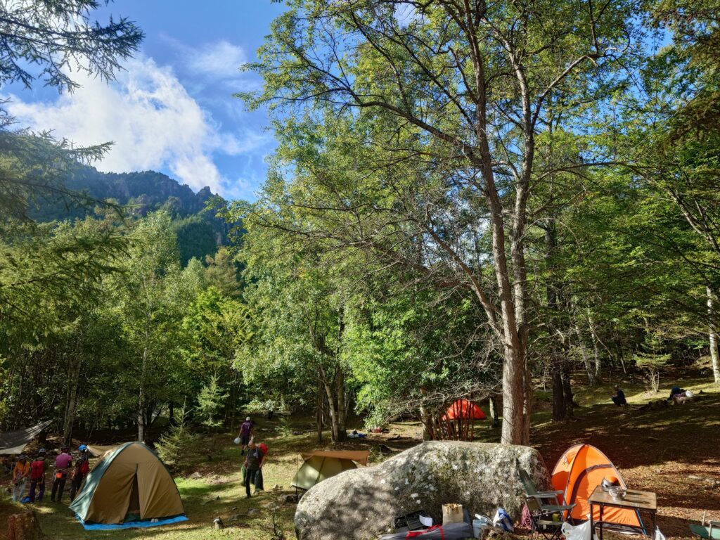 計画書通りに屋根岩2峰南稜〜セレクションへゆくことに決定し、今日こそ真面目に8時出発。奥の方までテントがびっしりで、私達同様に悪天候による他山域からの転進組が多いのかな?と思いつつ歩いてゆく。それにしても蒸し暑い。秋らしい爽やかさが微塵も感じられない。