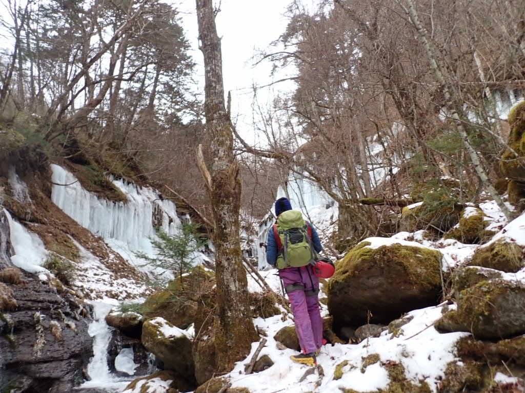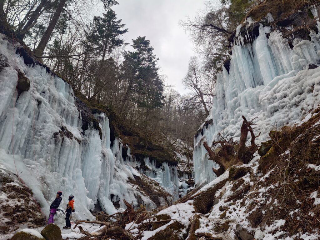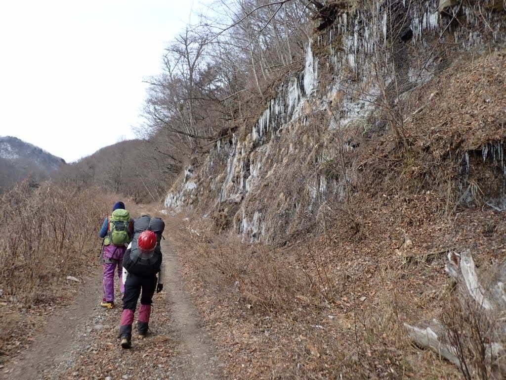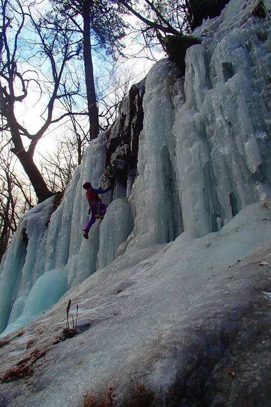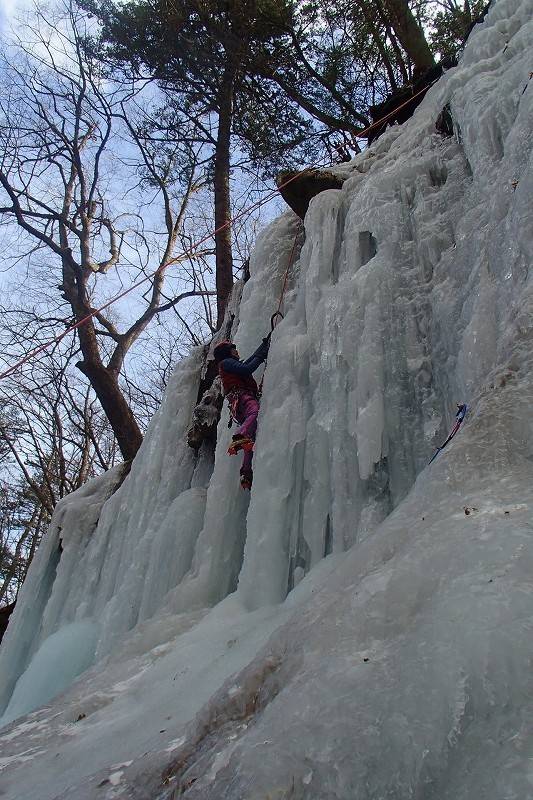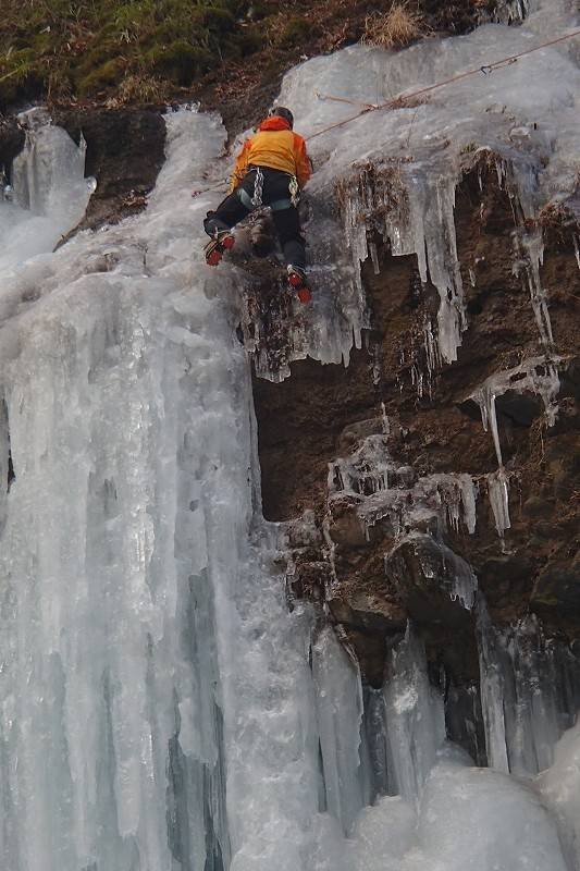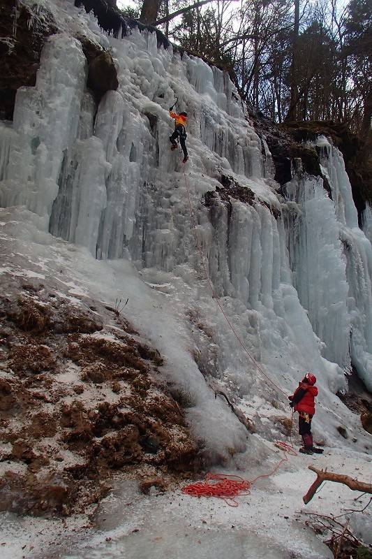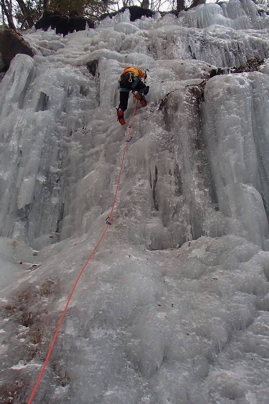 林道をのんびり歩いて45分、渓谷へと降りてゆくと両岸に氷柱が発達し、見事な景観だ。今日は平日の月曜なので空いている。まず一番易しいラインをリードして、トップロープをかけてこよう。