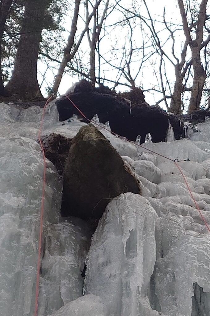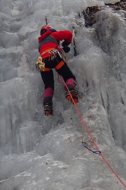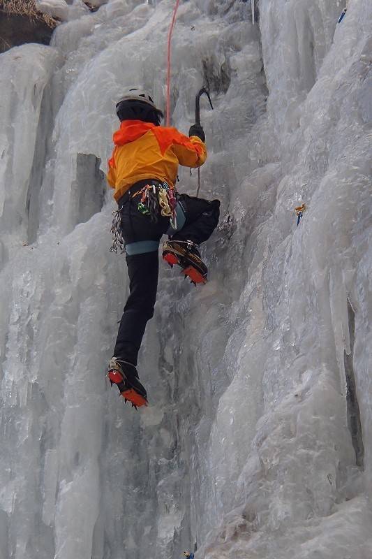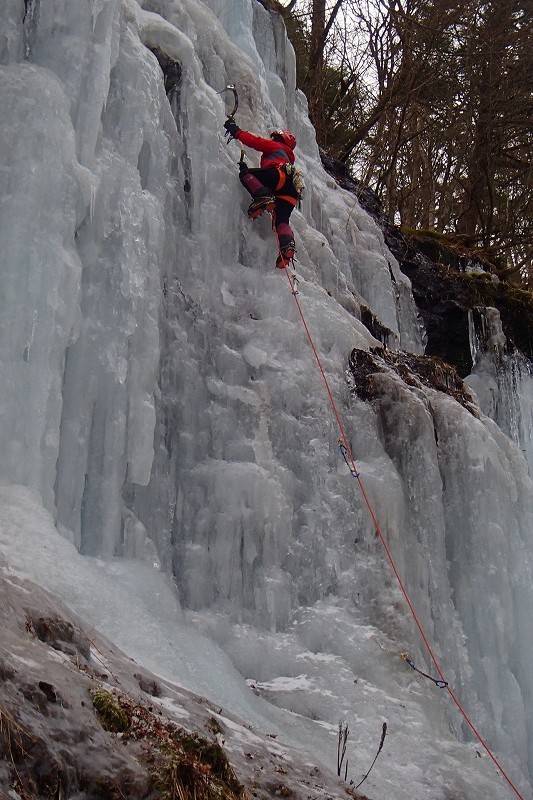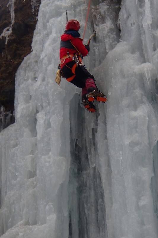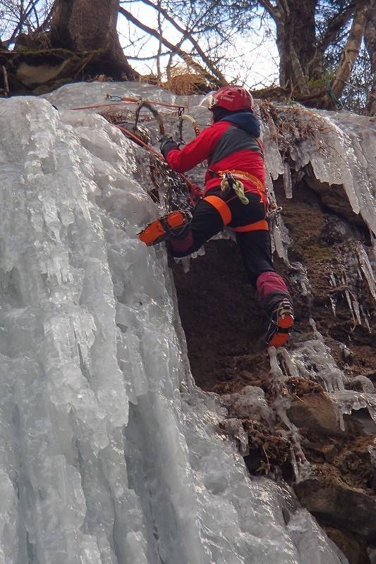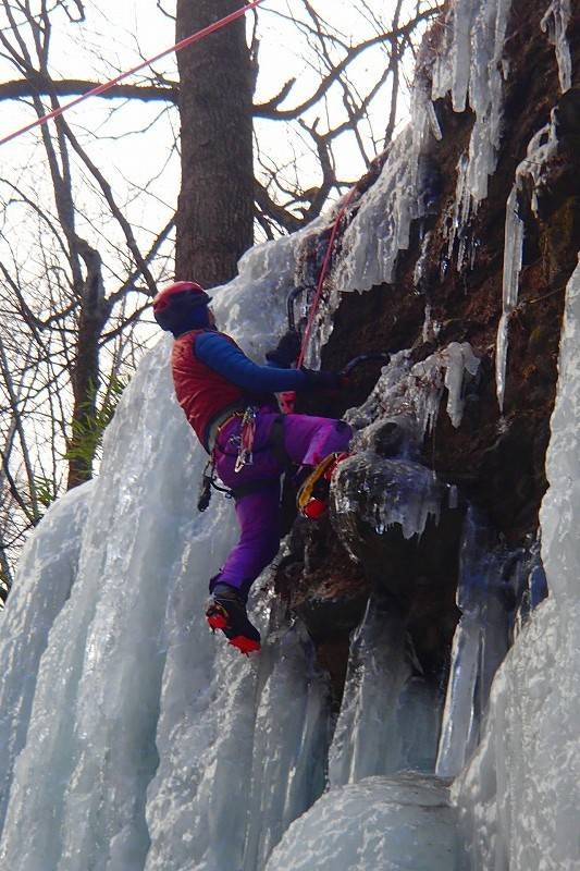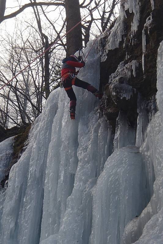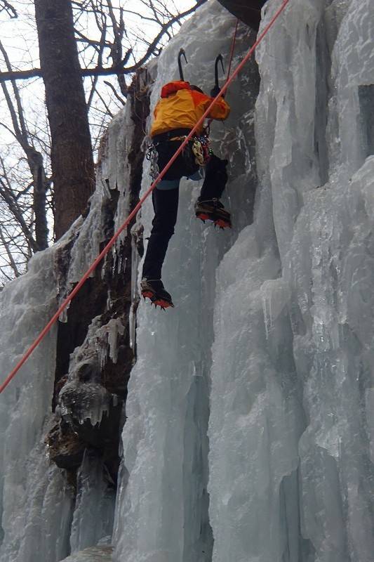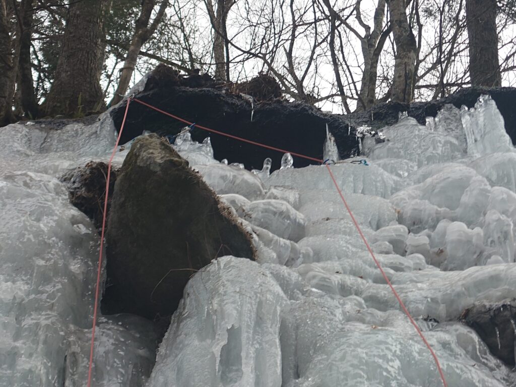 上部の薄い氷を慎重に使って登るのは良い経験になる。トップロープだから安心してチャレンジできる。最後に回収便を登って終了。