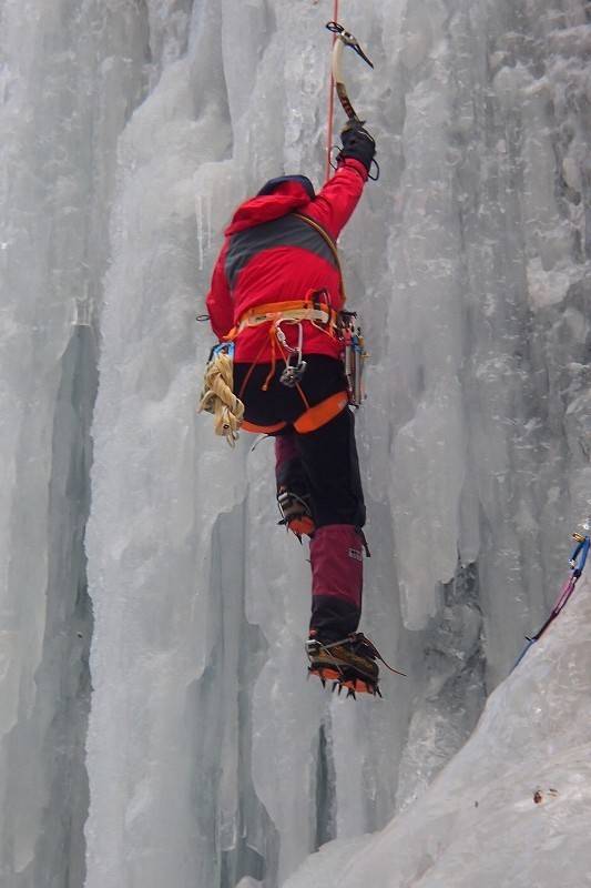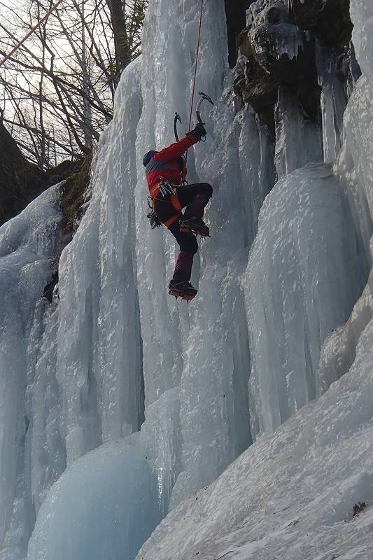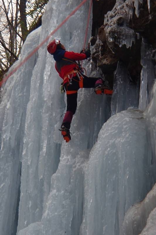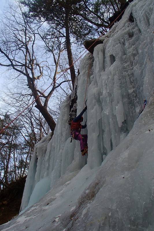 問題は解決。やれやれ、最初から気を配れるようになりたいものだけれど。その後は、トップロープで代わる代わる練習。最初にリードしたライン以外は、氷柱らしい傾斜キツめのルートばかり。でも短いので気軽にトライできるのがこのエリアの良いところ。