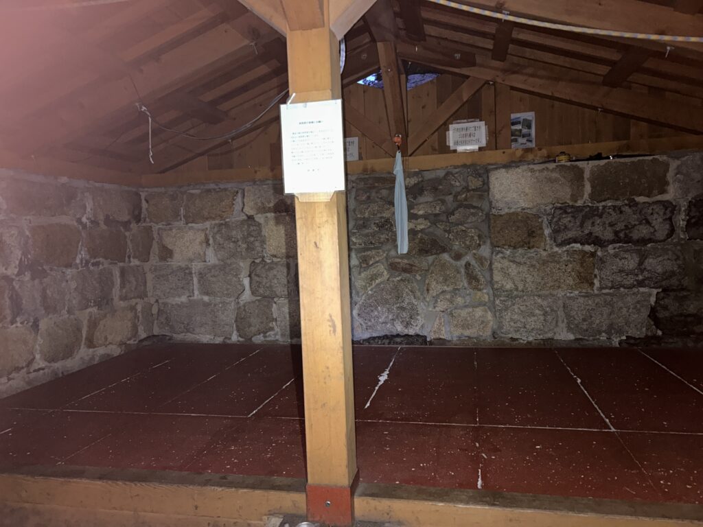 先行者3名の隣を使わせてもらう。6名が定員だろう。それ以上は土の上に泊まることになるが少し厳しい。水場入り口にソロテンとツエルト泊2名がいた。最後に到着した私たちが避難小屋をゲットできたのはとてもラッキーだった!小屋にはなぜかサンダルや銀マット、物干し用のスリングも完備されていて快適だったが、夜中にネズミがカサコソやってきてビックリ!!