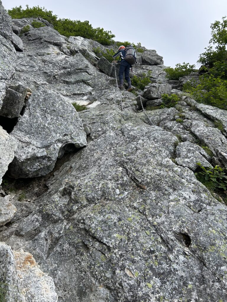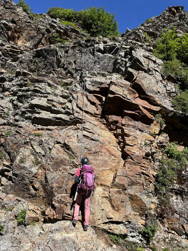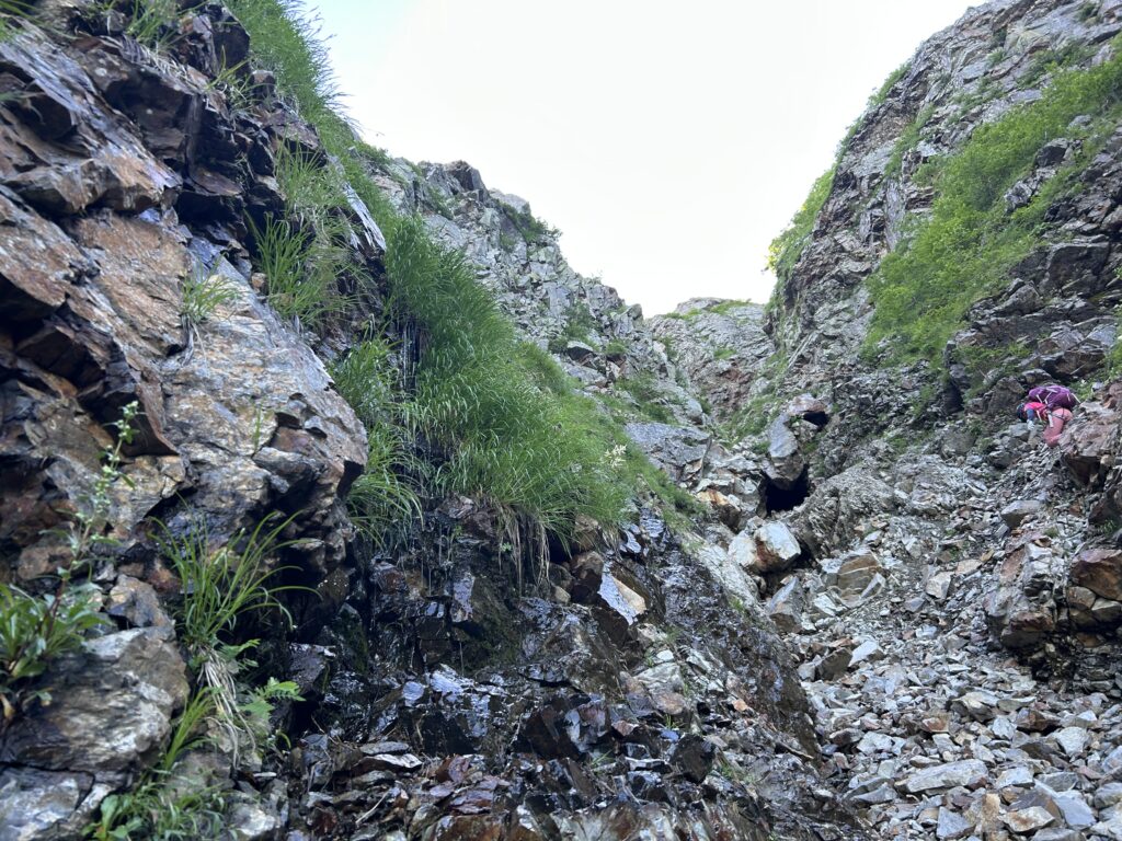 小ギャップからの登り。ここでせっかくなので歩荷したロープを使用する。鎖にクリップしながらIさんがリードして登った。