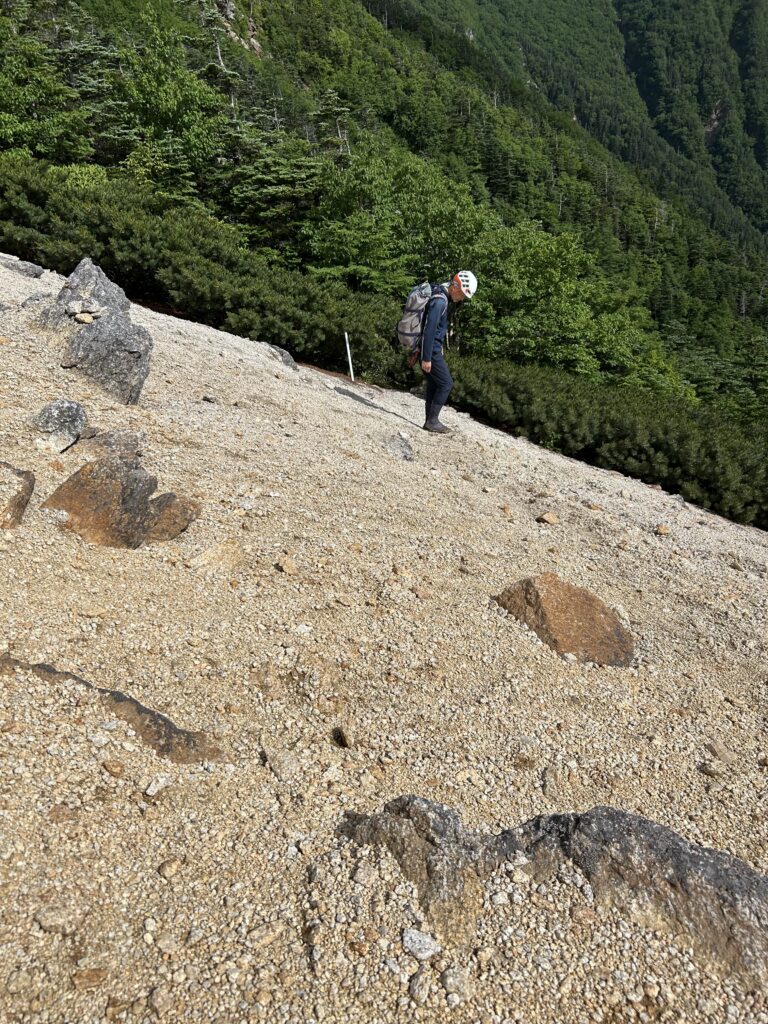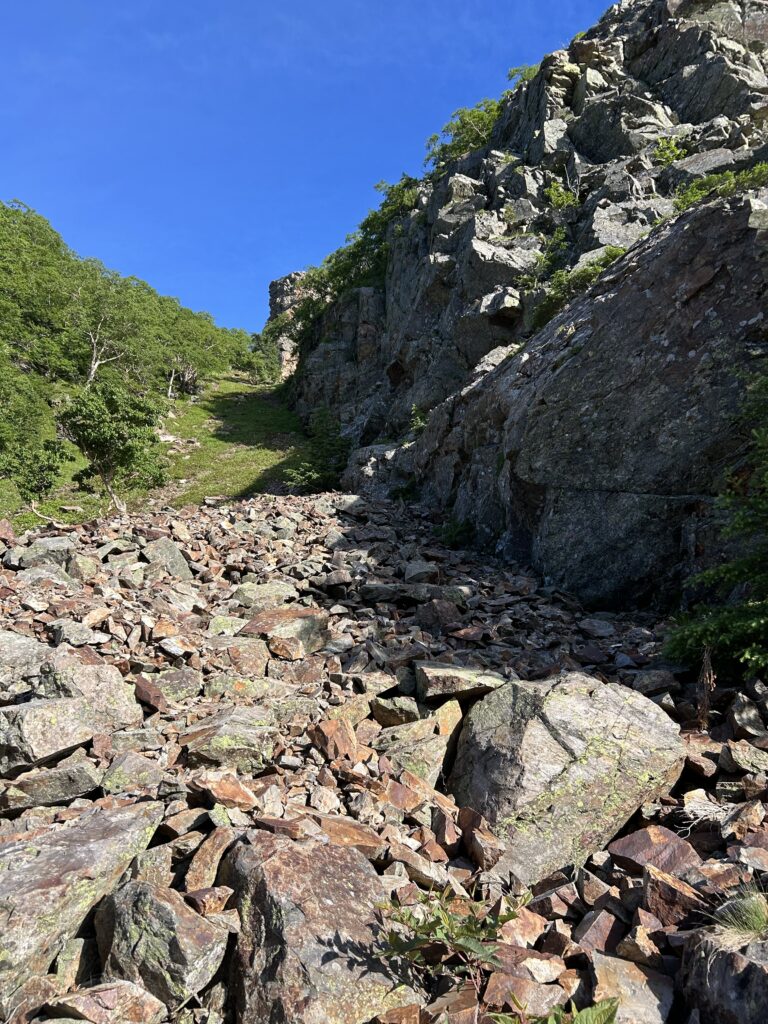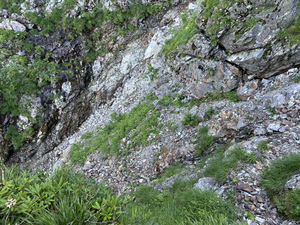 壁沿いに薄い踏み後あり。崩れやすいのでルートを見失わないように慎重にあがる。
