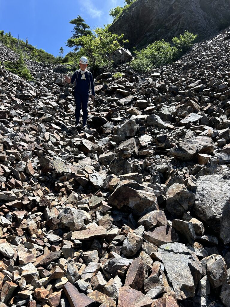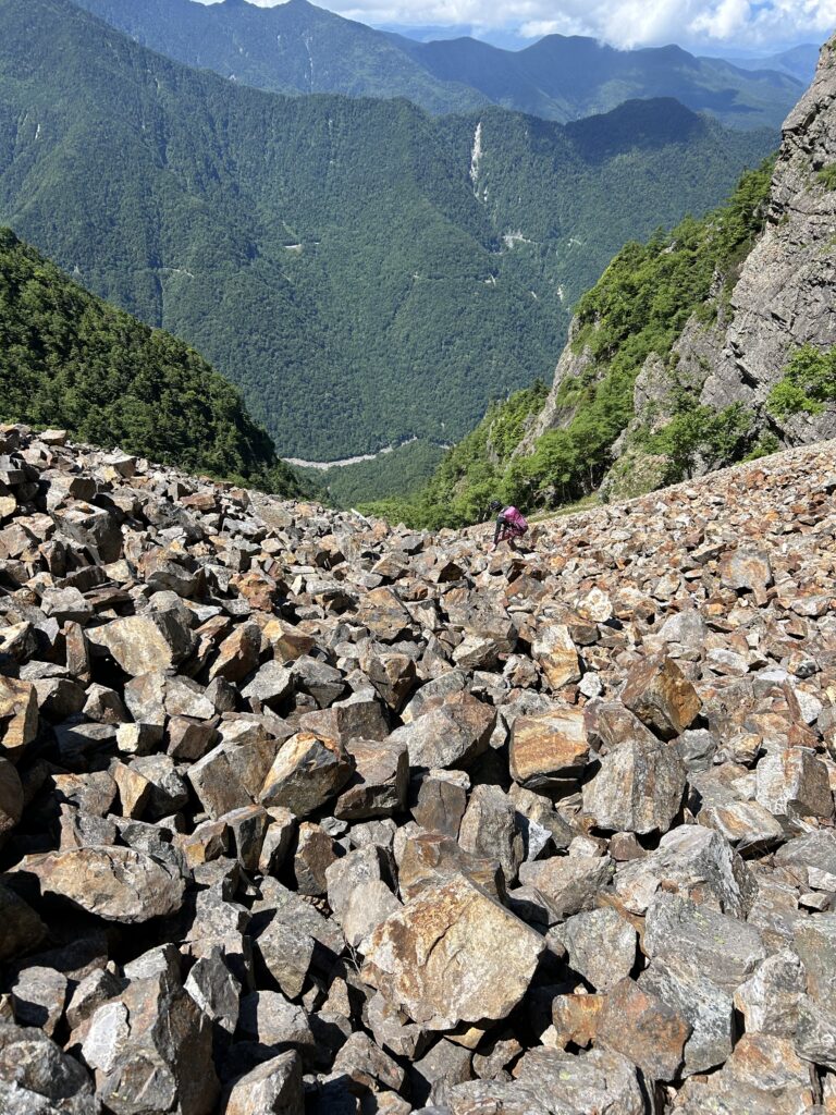 ガレとザレ祭り。ルートがわかりづらい。踏まれていないところは崩れまくる。足や手を置きたいところがアザミだらけ。ここを登山道とは呼んではいけない!!悪名高い角兵衛沢登山道。凶悪だった。途中岩屋跡の水場で水を補給し、角兵衛沢渡渉点に到着しホッとする。