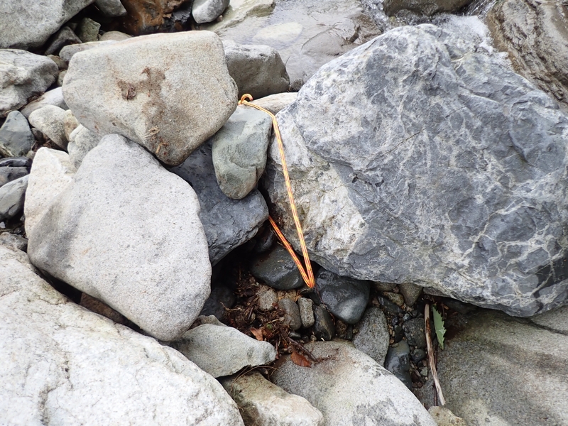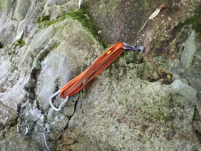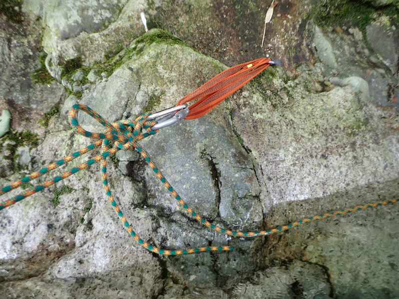 ロープを利用した渡渉(末端交換三角法)。