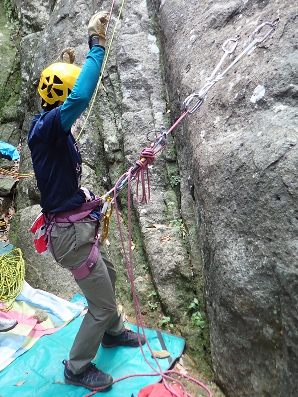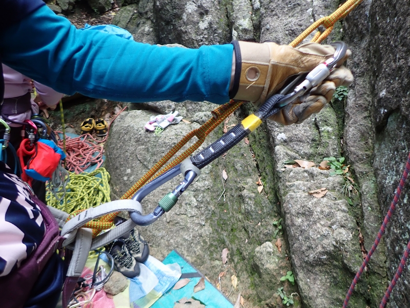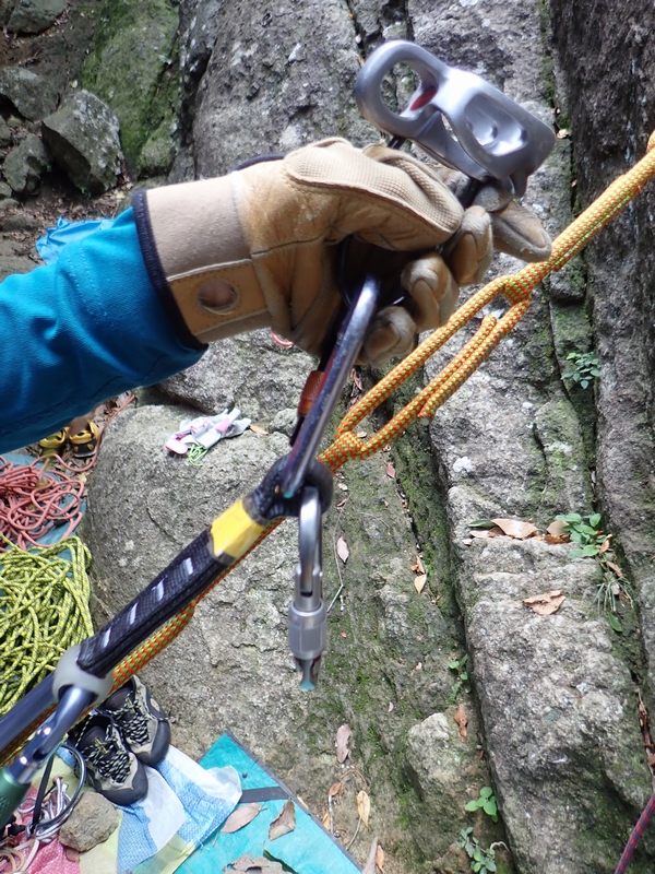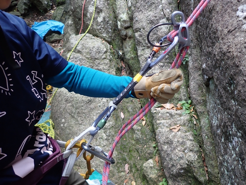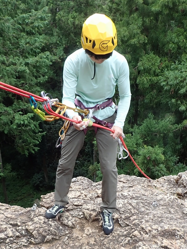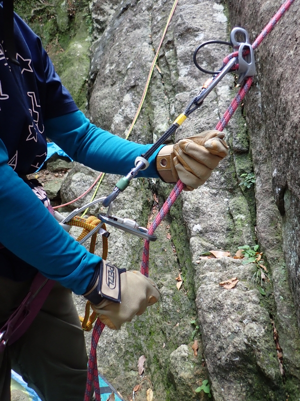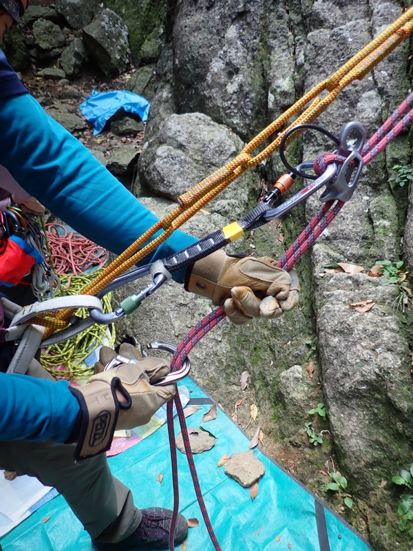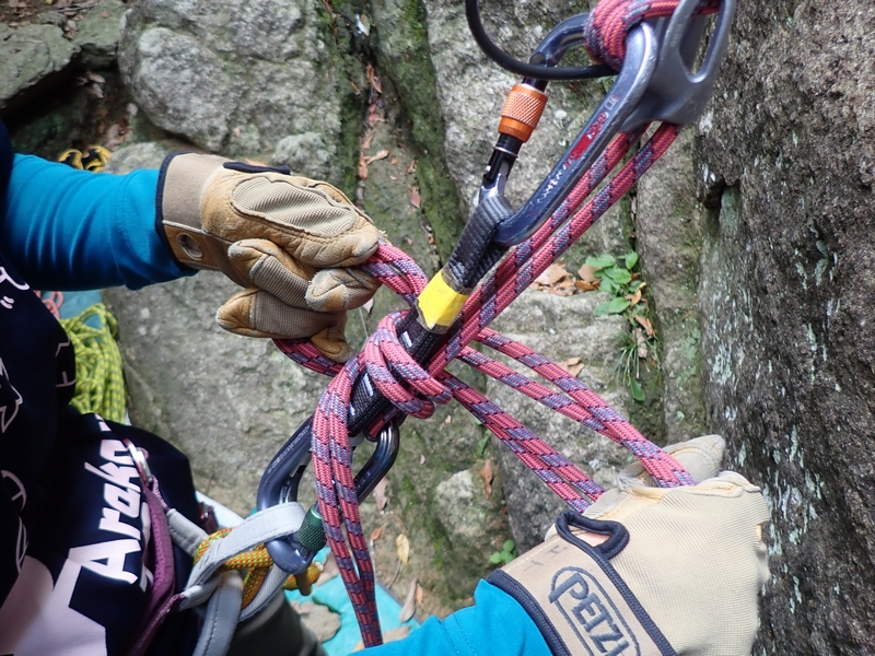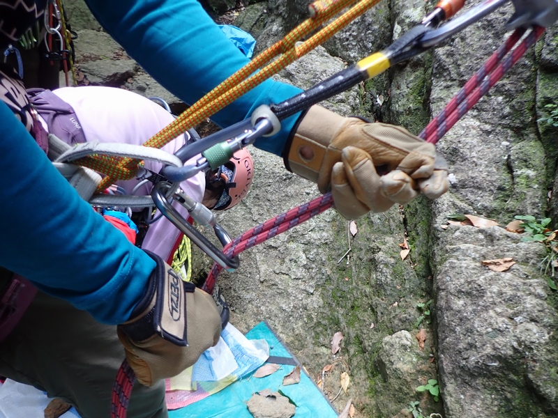 マルチピッチの懸垂下降では仮固定が必須課題です。いく通りかある中で、ヒロミさんに合いそうな方法を覚えてもらいました。