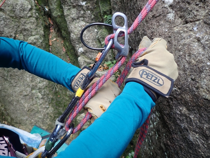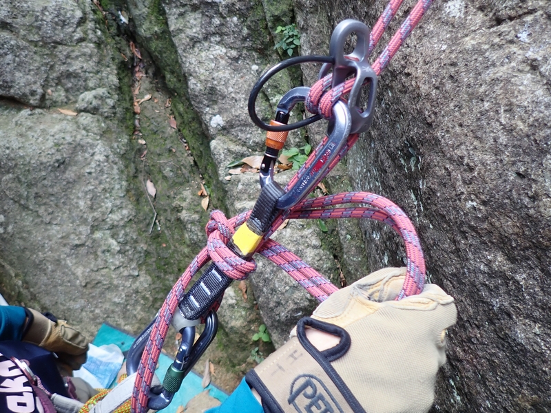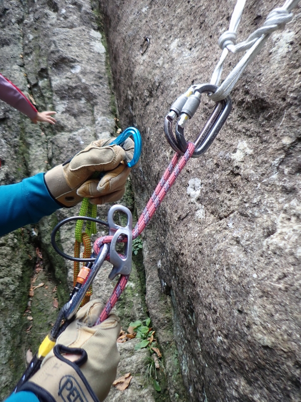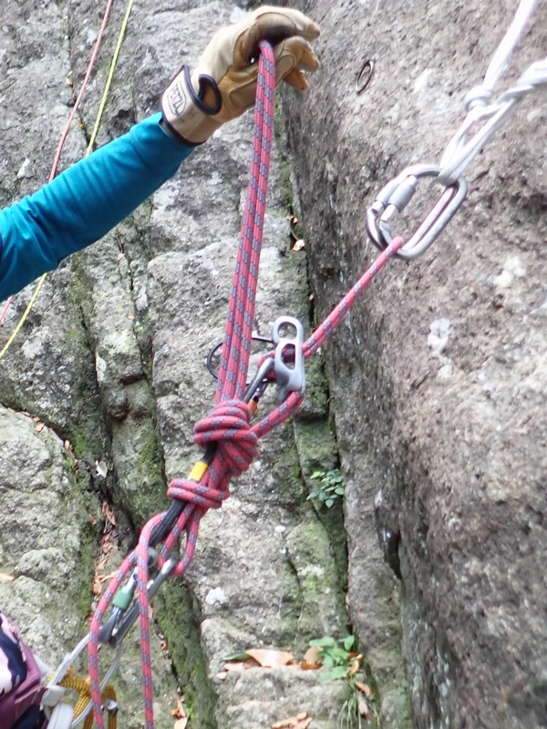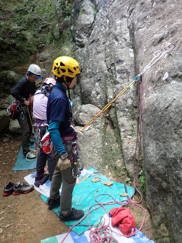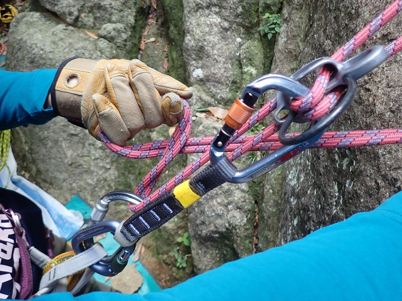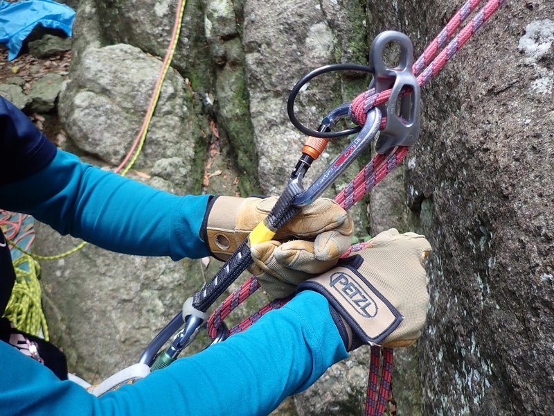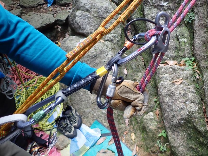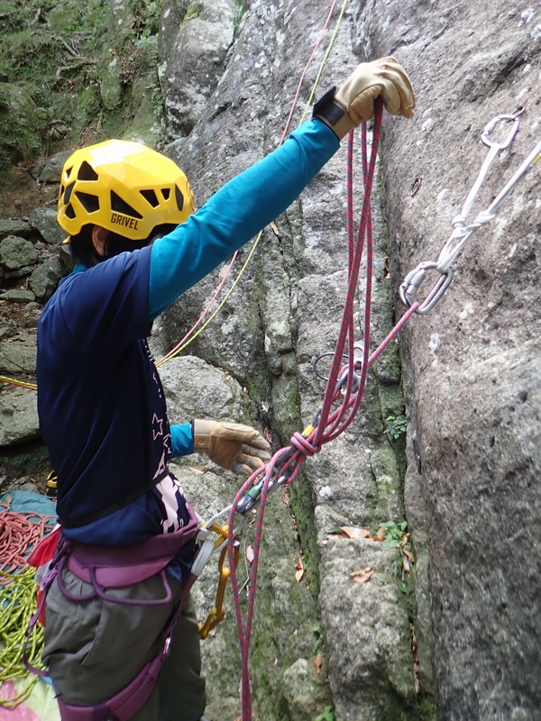 マルチピッチの懸垂下降では仮固定が必須課題です。いく通りかある中で、ヒロミさんに合いそうな方法を覚えてもらいました。