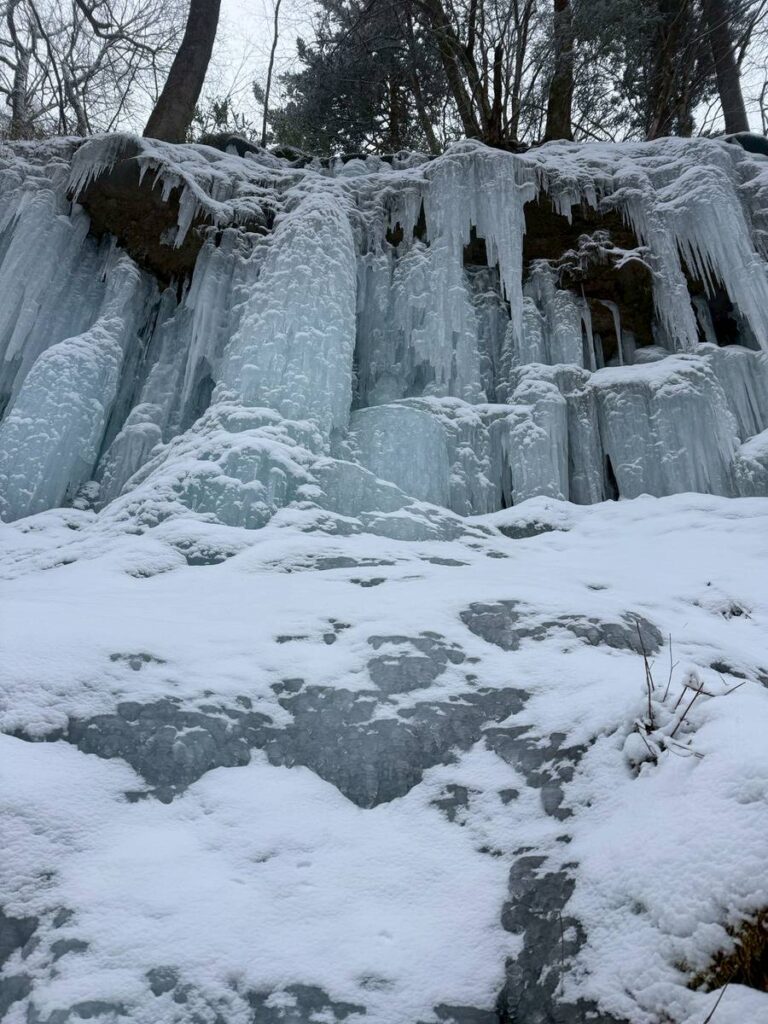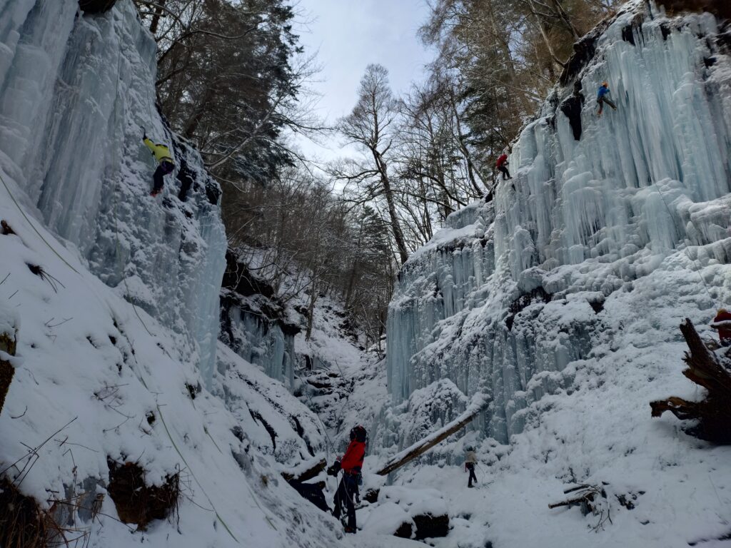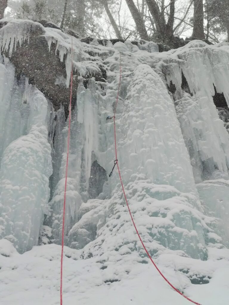 危なげなくそれなりにスムーズに登って、左のロープでハングルートチャレンジできるようにトップロープを張れたぞ、よしよし…と降りてくると、大師匠が「立ち上がったらアックスを直ぐ打つようにして」。やはりまだノンビリなのだ。