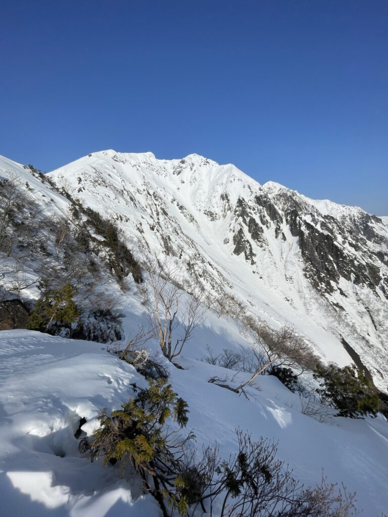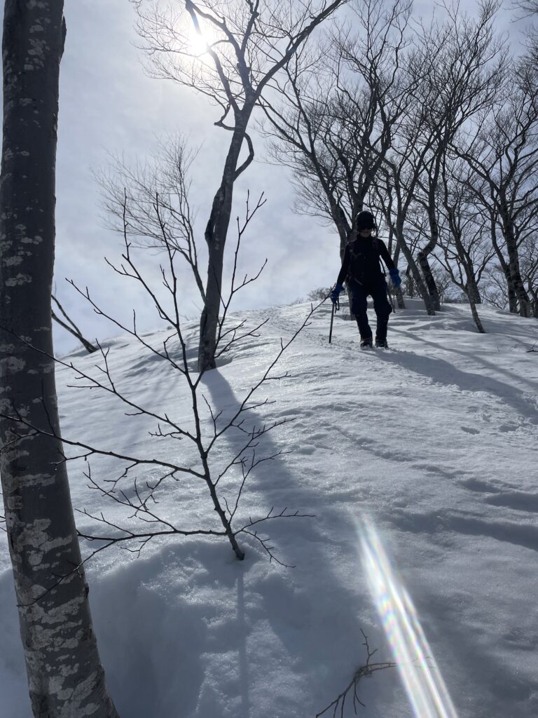 昨日も快晴であったが今日はさらに無風快晴の登山日和。雪が締まっていて歩きやすい樹林帯
