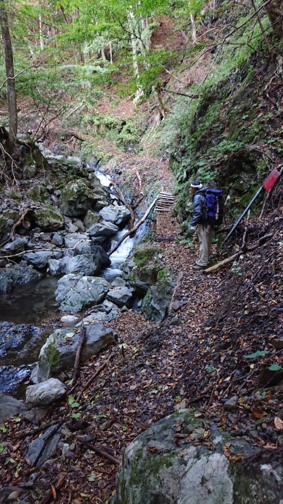 昼食を終えて歩き出す。急な下りをこなしていくにつれ、少しずつ沢音が近くなる。朝は寒々しく見えた沢も、正午を過ぎて陽が差すと魅力的に見えてくる。