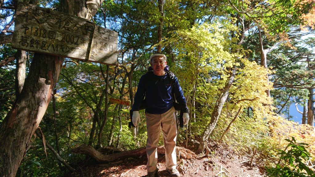 1,450mピークの少し南側で支尾根から主尾根に出た。我々の進行方向の逆、南西方面には大きな「通行禁止」の表示。二里観音の避難小屋に繋がる尾根だから、道が無くても行く人がいるのかも知れない。北へ進むと1,450mピークの先は急な下りになっている。標高差にして50mほど降りて少し登り返すと、登山道から右に少し外れたところにピークが見える。登ってみると標識が。
