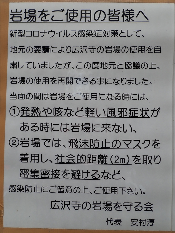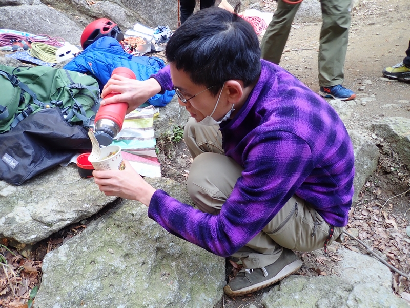 ここでお昼ご飯。ライターを忘れたショウ君、ポットのお湯を恵んでもらってカップ麵。そもそも岩場を利用させてもらっている地元と広沢寺の岩場を守る会との話し合いで、火器の使用は禁止されています。他の岩場にしても、それがマナーだと考えて良いでしょう。